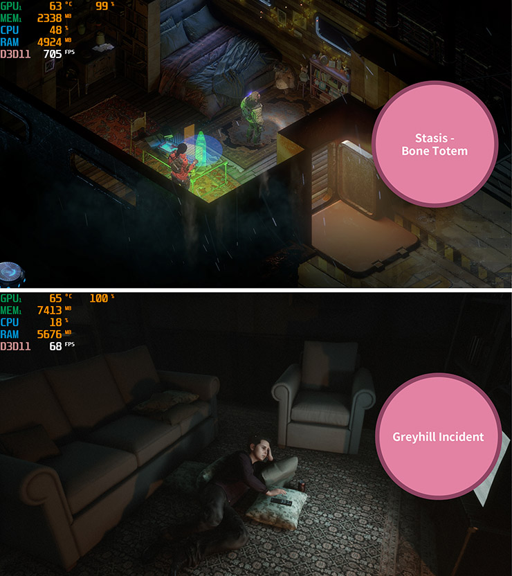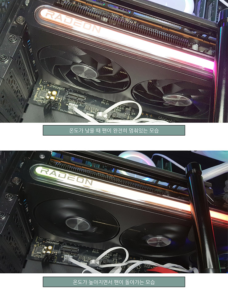 다양한 게임을 통해 쿨링팬의 성능을 알아본 결과,  대략 60% 로드율을 보이는 데들리 프리모니션 2 (Deadly Premonition 2)에서는 GPU 온도가 50 정도로 유지되었고 89%의 로드율을 보이는 chivalry2에서는 GPU 온도가 60도 정도로 나왔으며  로드율이 99%에 육박하는 스테이시스 본 토템 (Stasis - Bone Totem)과 로드율이 100%인  그레이힐 인시던트 (Greyhill Inciden)에서도 GPU 온도는 65도를 넘지 않았다.
