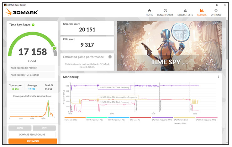3D MARK DEMO 타임 스파이 벤치마크테스트에서 그래픽 스코어가 20151점이 나왔다.  하드코어 게이밍 그래픽카드로써 부족함이 없는 점수다.