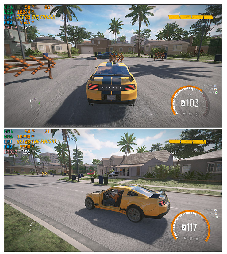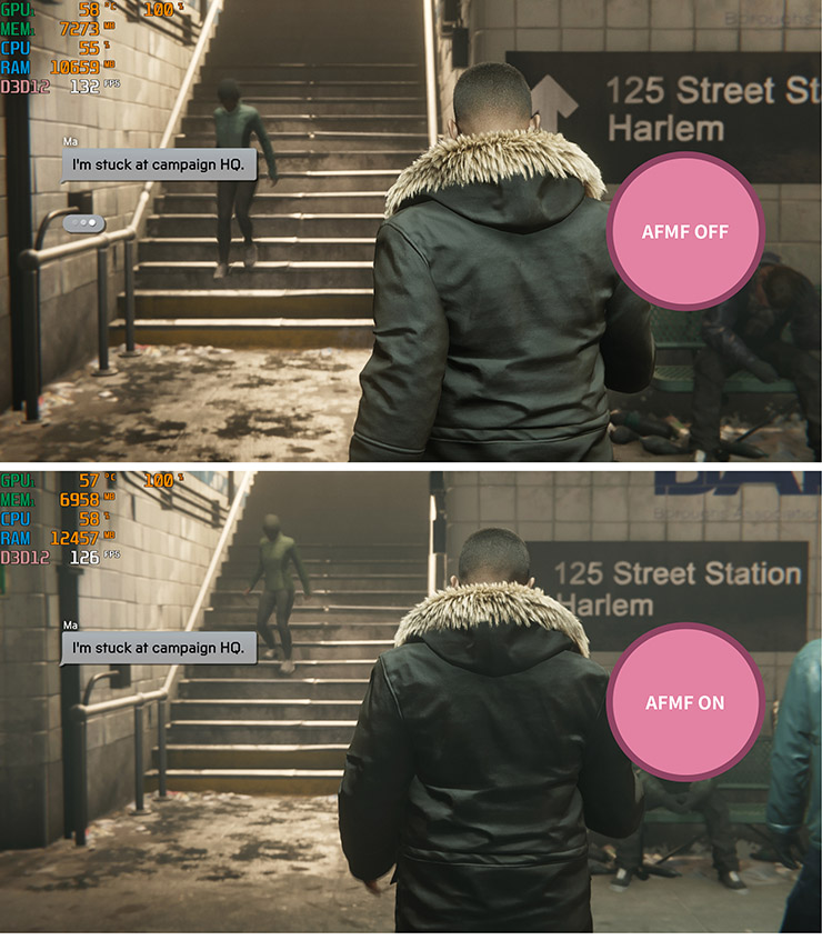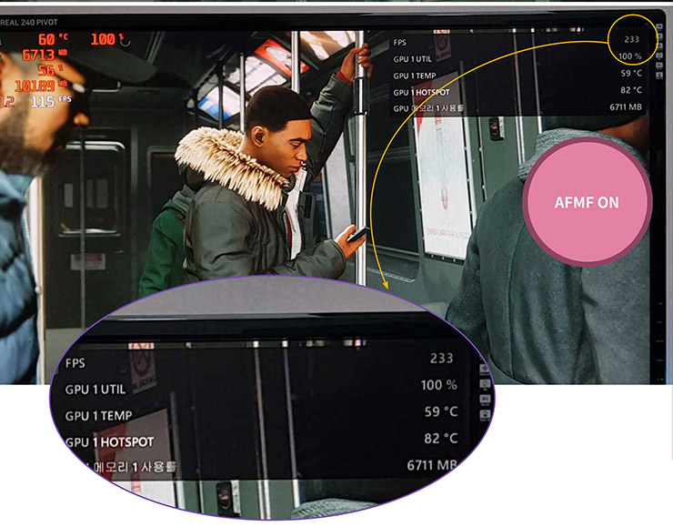 하지만 AFMF가 만들어낸 프레임이 원본 프레임이 더해지면서 최종 프레임의 수 이전과는 비교할 수 없을 정도로 증가했다.  예컨대 위 장면에서는 115인 게임 원본 프레임이 AFMF에 의해 233이 되었다. 상당히 흥미로운 기능이다.