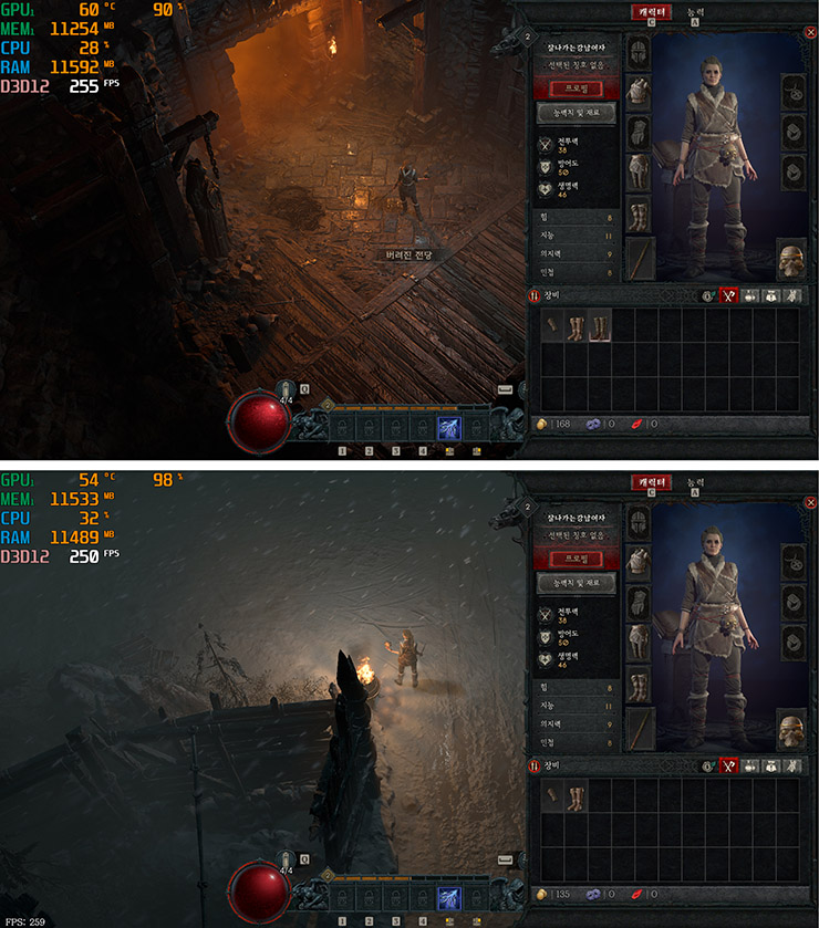 먼저 디아블로4를 돌려보니 마을, 필드, 던전 할 것 없이 대략 250 정도의 프레임이 나왔다.