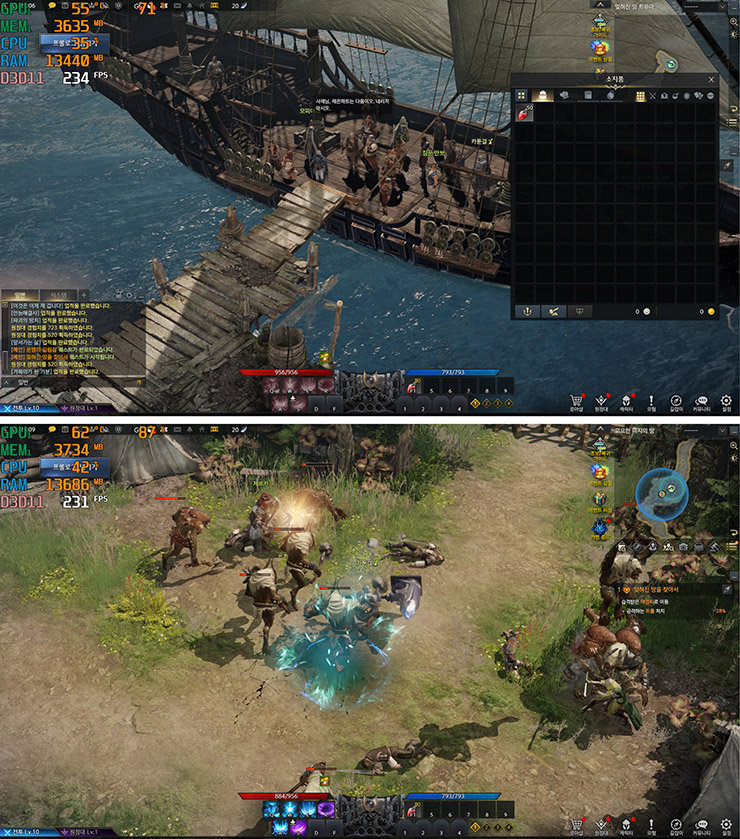 로스트 아크는 옵션엔 나와있지 않으나 최대 프레임이 모니터 주사율까지로 제한되어 있는 모양이다.  그래서인지 마을이나 이벤트씬에서는 거의 240 고정 프레임이 나왔다. 또한 수많은 적과 난타전을 벌일 때도 200미만으로 잘 떨어지지 않아 쾌적한 게임 진행이 가능했다.