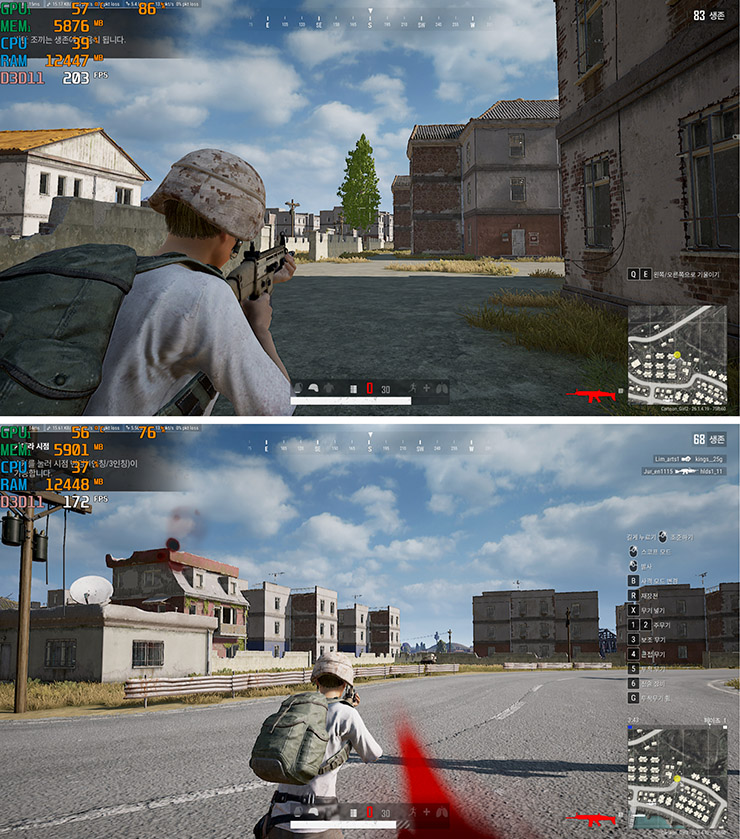 배틀그라운드는 건물 안에서는 200이상의 프레임이 가볍게 나왔고 야외에서도 150 이하로는 잘 떨어지지 않았다.