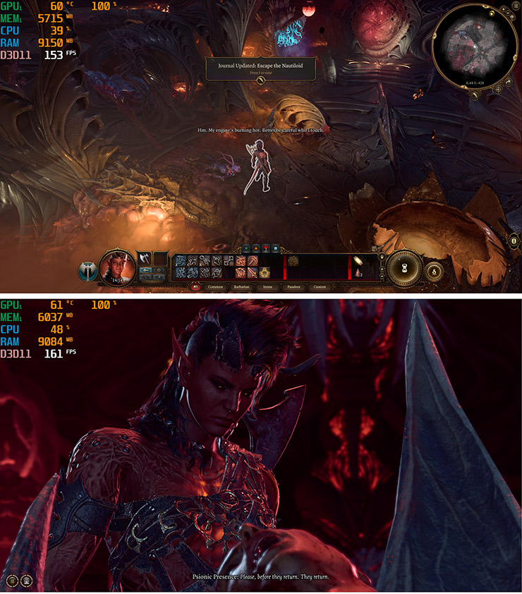 발더스 게이트3는 저사양 그래픽카드에선 버벅거리기로 유명한 게임이지만 사파이어 라데온 RX 7800 XT에서는 150프레임을 넘는 쾌적한 성능을 보여준다.