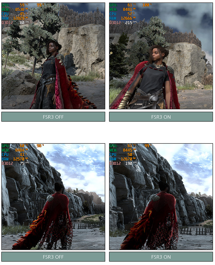 사파이어 RX 7800 XT에서 FSR3의 성능향상은 놀라웠다.  FSR3를 적용하지 않았을 때와 비교하면 화질이 크게 저하되지 않았음에도 불구하고 초당 프레임은 압도적으로 올라갔다.