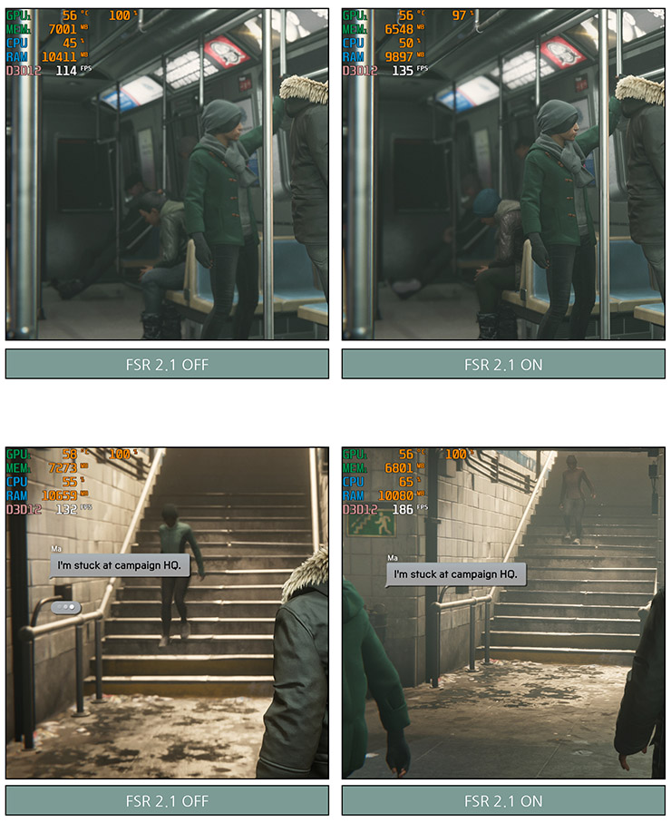 그래픽 퀄리티 프리셋 HIGH에서 FSR 2.1을 Performance로 놓고 테스트 해 본 결과,   FSR3보다는 품질이 떨어지지만 그래도 꽤 인상적인 성능을 보여주는 것을 확인할 수 있었다. 참고로 마블 스파이더맨 마일즈 모랄레스에서 FSR 2.1 모드를 수동 변경하기 위해서는 DRS (다이나믹 레졸루션 스케일링) 기능을 꺼야 한다.