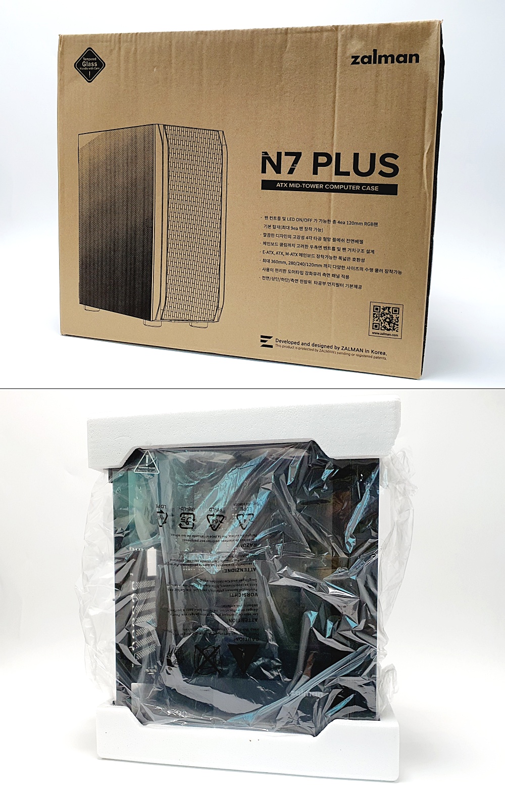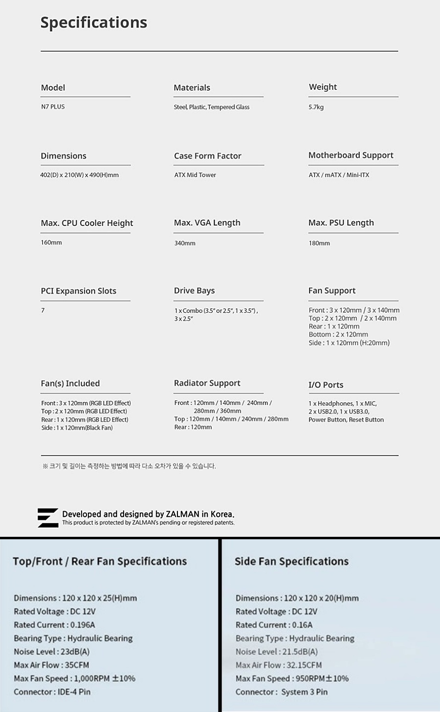 잘만 N7 PLUS는 표준 ATX 규격의 미들타워 PC케이스로써, 상세한 제원과 스펙은 사진에서 확인할 수 있겠습니다. 가장 큰 특징은 역시 메인보드에서 제일 온도가 높은 전원부 부분을 식혀줄 수 있는 핫존 전용 쿨링팬을 포함한 총 7개의 기본 팬을 제공한다는 점입니다.