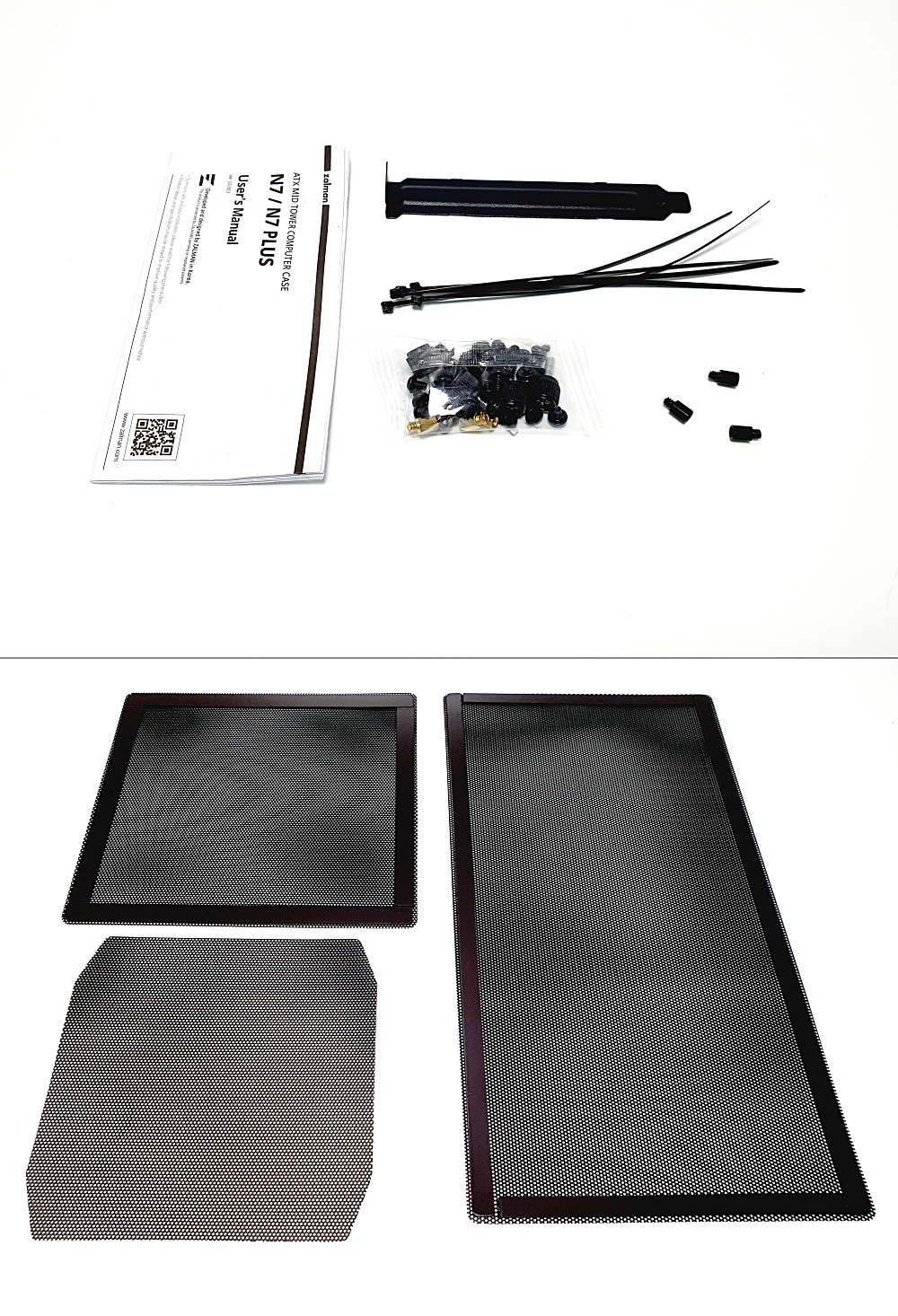 기본 구성품으로 설명서와 조립에 필요한 각종 나사, 케이블 타이, PCI 슬롯 커버 1개, 그리고 먼지 필터를 제공합니다. 상단 먼지 필터와 측면 먼지 필터는 마그네틱 부착 방식이며 하단 먼지 필터는 필름 삽입 방식입니다. 사진상에서 가장 긴 것이 상단, 정사각형 모양이 측면, 나머지가 하단이 되겠습니다.