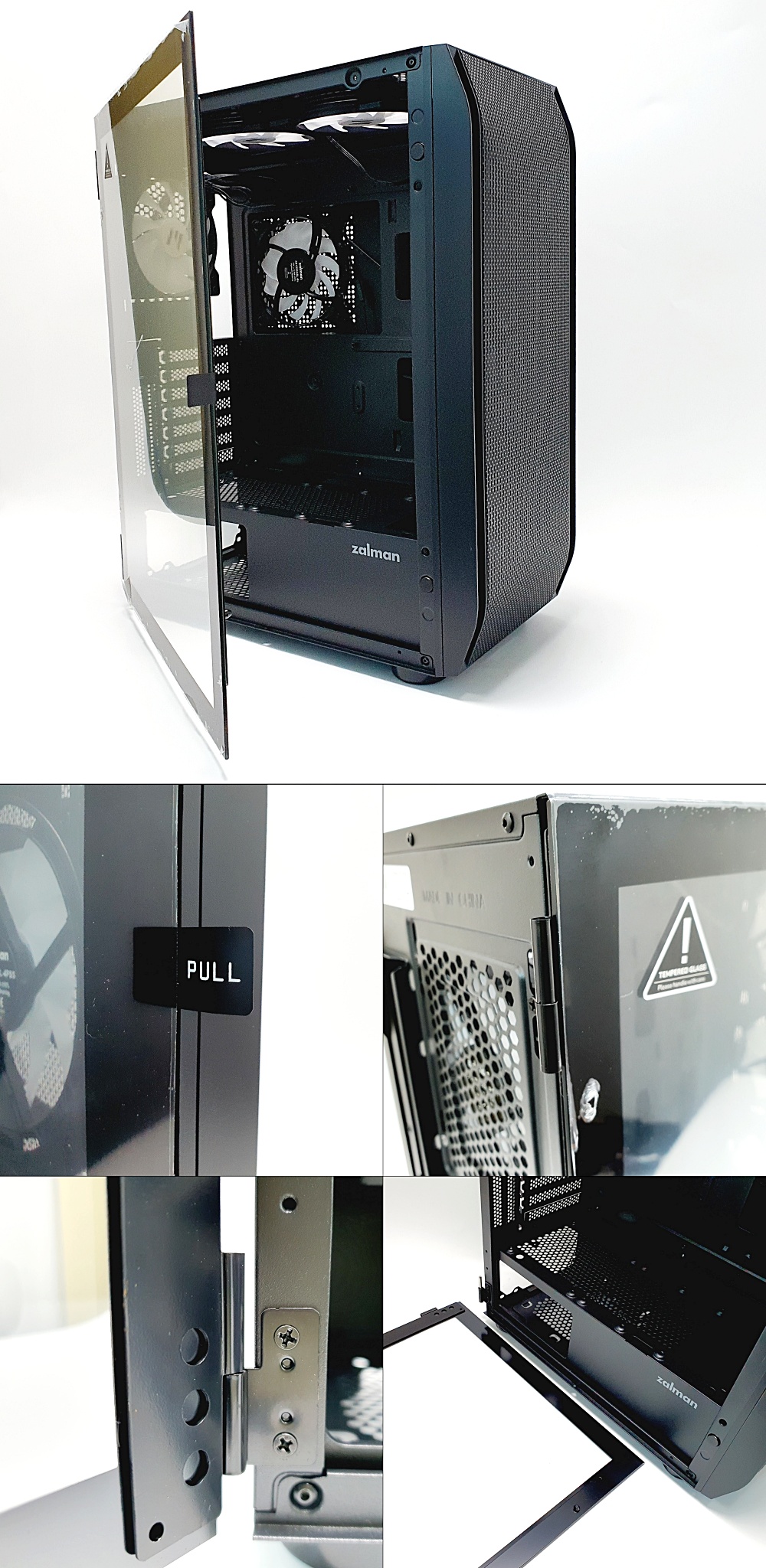 PC케이스의 기본기라고 할 수 있는 조립과 유지 보수 편의성은 케이스 설계 내공이 높은 잘만의 케이스답게 준수한 편입니다. 편의성 부분도 꽤 만족스러운데, 상단 리셋 스위치를 LED ON/OFF 및 팬 컨트롤이 가능한 버튼으로 사용할 수 있으며, 측면 패널은 힌지 타입으로 열고 닫기 편할 뿐만 아니라 폭발할 위험도 상대적으로 적습니다.