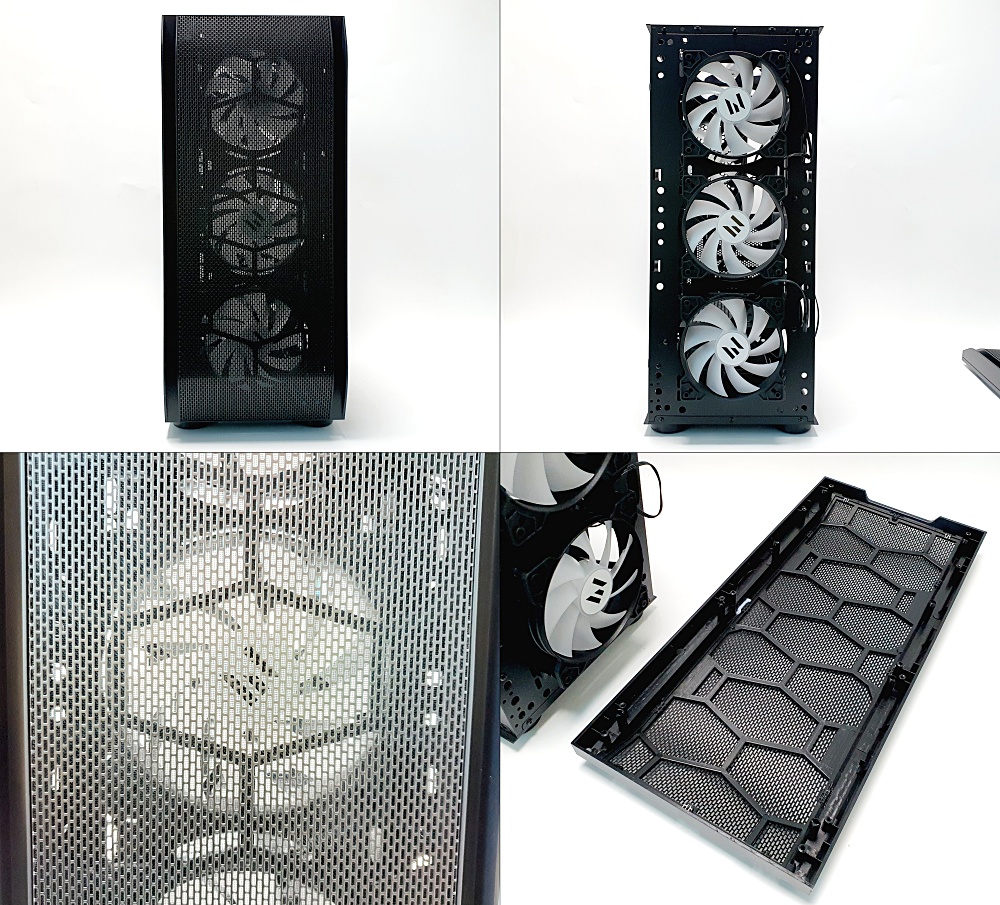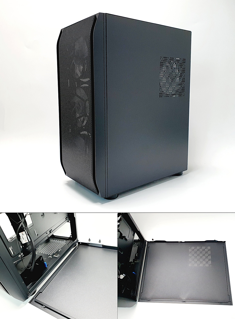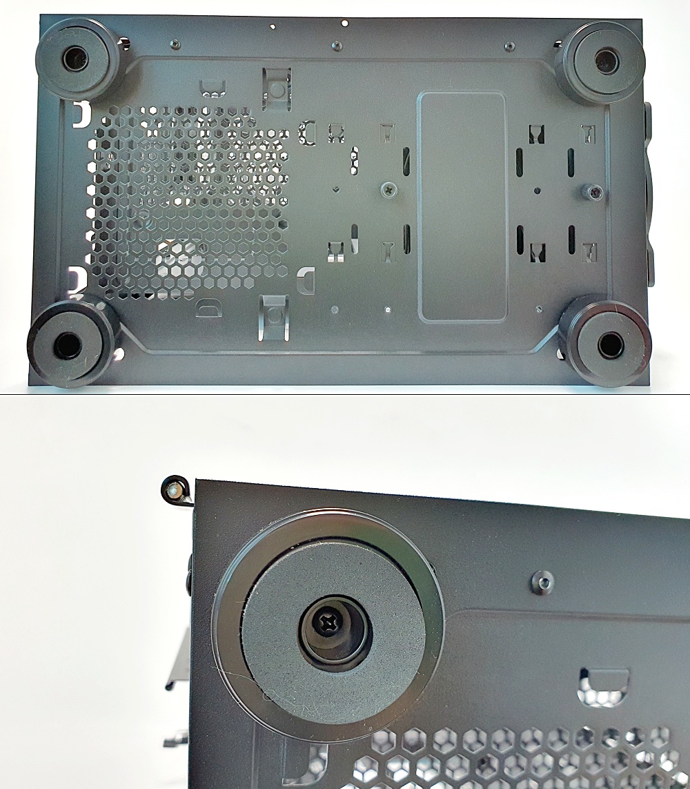 하단에는 먼지 필터를 필름 방식으로 부착할 수 있으며, 모서리 부분에 미끄럼 방지 고무 패드가 부착되어 있어 진동을 최소화 하고, 찬 공기를 파워서플라이로 내부로 유입하기 위한 공간을 확보합니다.