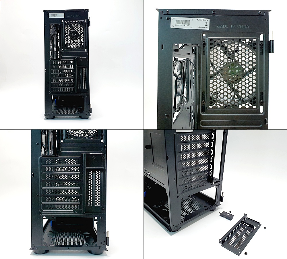우측 패널은 평편한 플랫 형태이며, 새시 홈에 밀어 넣고 후면 손 나사 2개로 고정하는 방식입니다. 잘만 N7 PLUS PC케이스는 메인보드 핫존 전용 쿨링팬을 기본으로 제공하므로 그 부분에 공기흐름을 위한 에어밴트 타공이 되어 있습니다.