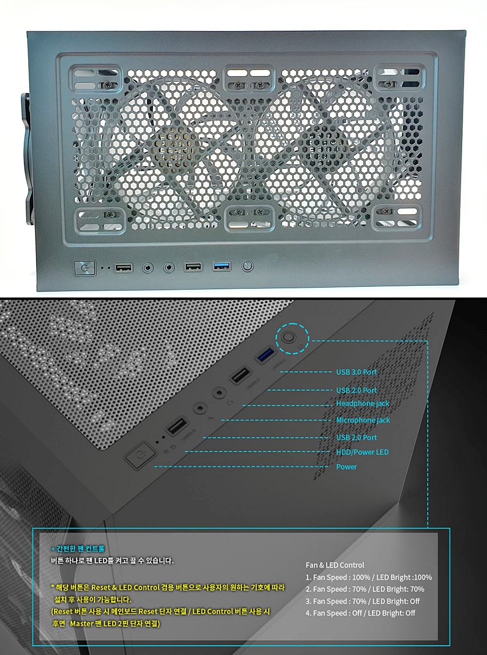 상단 먼지 필터는 마그네틱 방식으로 부착이 가능하며 I/O 포트들은 우측 상단에 위치해 있어 사용하기 편리하고 선 정리도 용이합니다. 아쉽게도 USB-C 포트는 없지만 리셋 스위치를 통해 팬 컨트롤이 가능합니다. 팬 속도와 LED 밝기를 동시에 조절할 수 있으며 버튼을 누를 때마다 4단계로 동작합니다.