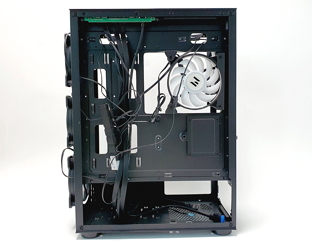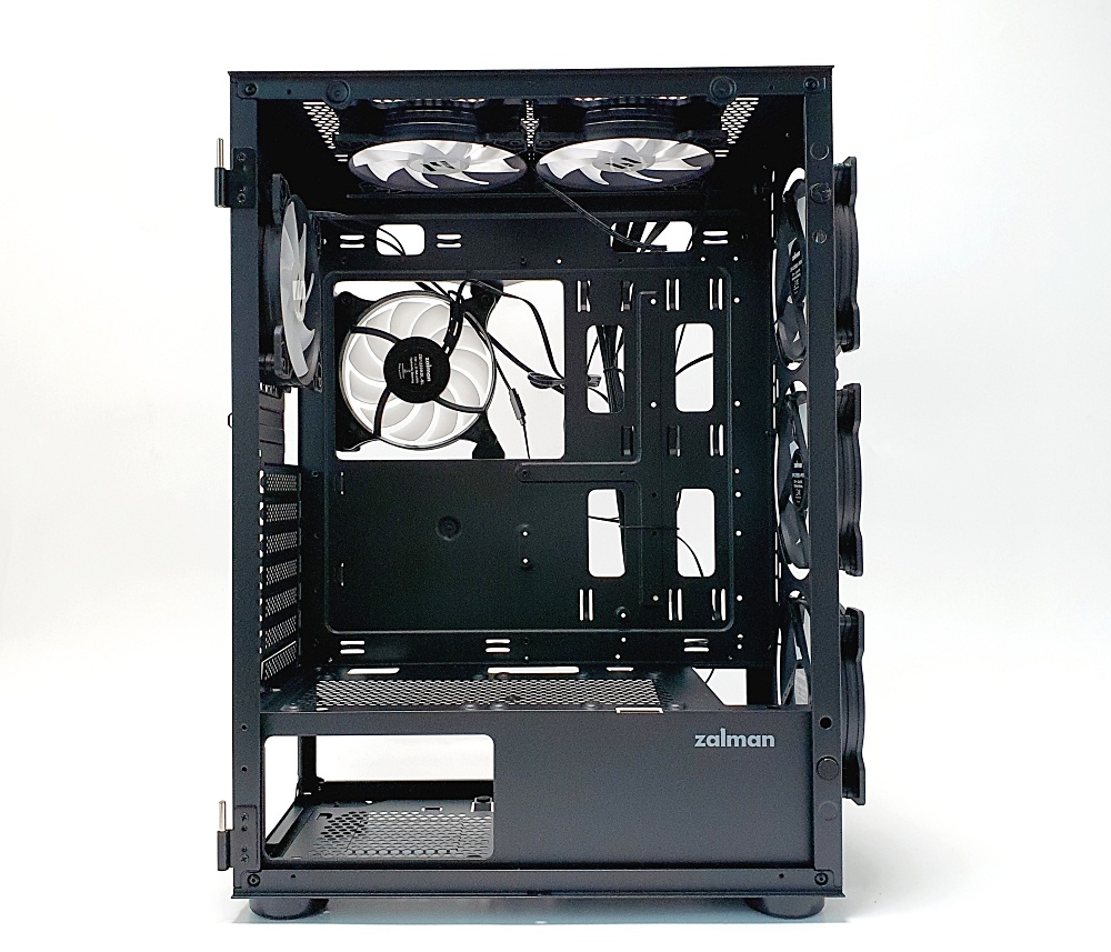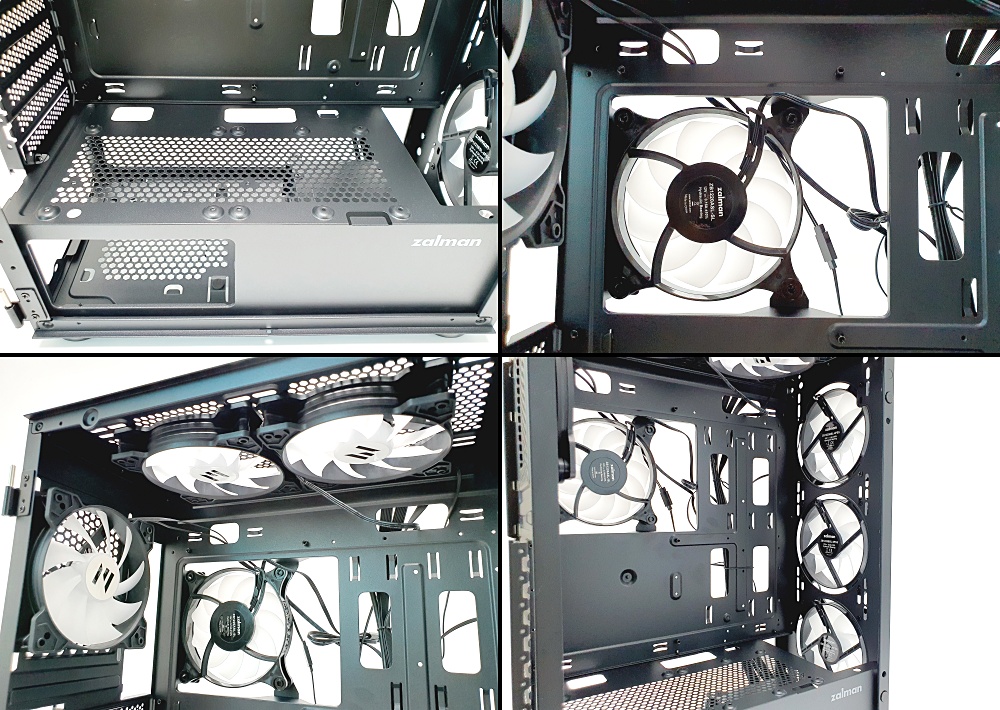 총 7개의 쿨링팬이 케이스 내부에 든든하게 자리 잡고 있으며 메인보드 핫존 쿨링을 위한 측면 쿨링팬이 눈에 확 들어오는군요. 보통 메인보드에서 열기가 가장 집중되는 부위가 CPU 장착부 및 전원부 인데, 잘만 N7 PLUS PC케이스는 이 메인보드 핫존을 집중적으로 냉각할 수 있는 전용 120mm 쿨링팬을 기본으로 제공합니다. 파워서플라이 체임버 윗 공간에도 공기 흐름을 위한 타공이 되어 있으며 이곳에 추가로 쿨링팬 부착이 가능합니다.