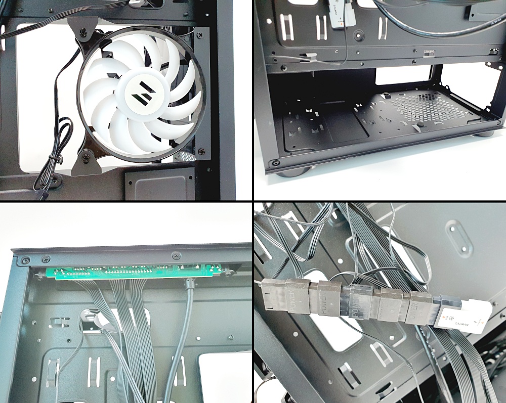 RGB 쿨링팬의 조명을 이용해 시스템 내부를 연출하기 위해서는 역시 사진처럼 6개의 팬이 모두 RGB를 지원해야 합니다. 이 부분은 굉장히 마음에 드는군요. 잘만의 배포에 엄치를 세우고 싶습니다. 비록 쿨링팬의 색상이나 패턴 변경은 불가능하지만, 기본으로 제공되는 레인보우 조명 효과가 몽환적이면서도 영롱하니 블랙 색상과 굉장히 잘 어우러져 이쁩니다.