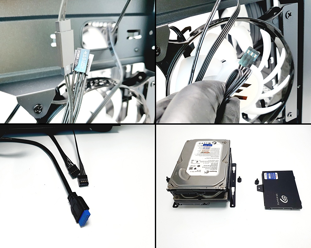 사진처럼 케이스 리셋 케이블을 마스터 팬에 연결해서 리셋 스위치를 팬 컨트롤러 버튼으로 사용 가능합니다. 상단 USB 포트를 사용하기 위한 케이블과 오디오 케이블도 당연히 제공하며, 측면 팬은 혼자 유일하게 3핀 전원 케이블을 사용하는군요. 스토리지 베이에는 사진처럼 HDD를 2개까지 장착이 가능하며 케이스 기본 브래킷을 사용해 SSD를 측면에 장착 가능합니다.