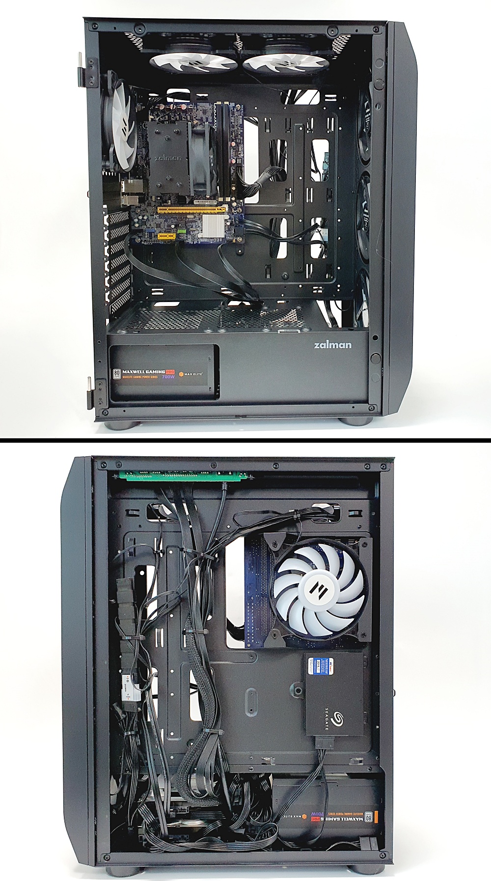 잘만 N7 PLUS PC케이스를 사용해 시스템을 완성해 보았습니다. 저장장치는 HDD2개와 SSD1개를 사용했으며, 그래픽은 CPU 내장 그래픽을 사용했습니다. 호환되는 CPU 쿨러 높이는 160mm 이며, 그래픽카드 길이는 340mm입니다. 일렬로 연결된 몰렉스 4핀 케이블에 전원을 공급하고 측면 팬 3핀 케이블을 메인보드에 연결하는 것만 주의한다면 무난하게 조립이 가능합니다. 모듈러 파워를 사용한다면 사진보다 더욱 깔끔하게 정리가 가능하겠지요. 케이스 자체에 선 정리를 위한 타공들과 케이블 타이 홀들이 많아 조립 자체의 난이도는 평이했습니다.