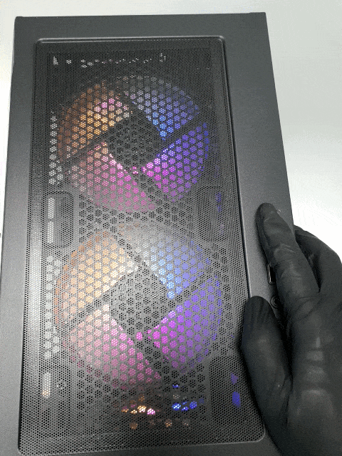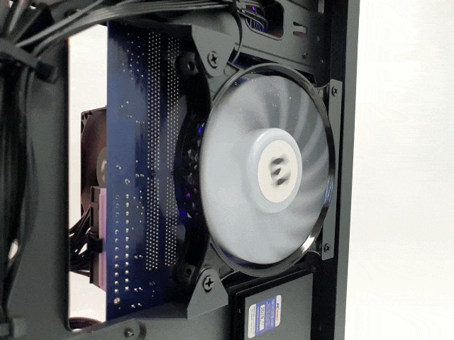 측면 팬 역시 잘 동작합니다. 사진처럼 흡기 방향으로 세팅되어 외부의 찬 공기를 온도가 높은 메인보드 핫존으로 잘 유입할 수 있습니다. 이 측면 쿨링팬은 분리가 가능하니 사용자에 필요에 따라 탈부착 하면 되겠습니다.