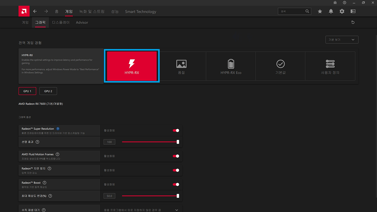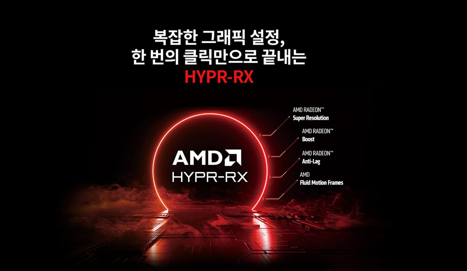 HYPR-RX는 AMD Super Resolution, AMD Radeon™ Boost, AMD Radeon™ AntiLag, AFMF (AMD Fluid Motion Frames) 기본 설정으로 세팅되어 있지만 사용하는 하드웨어 환경에 따라 FSR 2. FSR 3+ FMF, RSR, Anti-Lag, Boost, Chill 기능도 다양하게 결합해서 사용이 가능합니다.