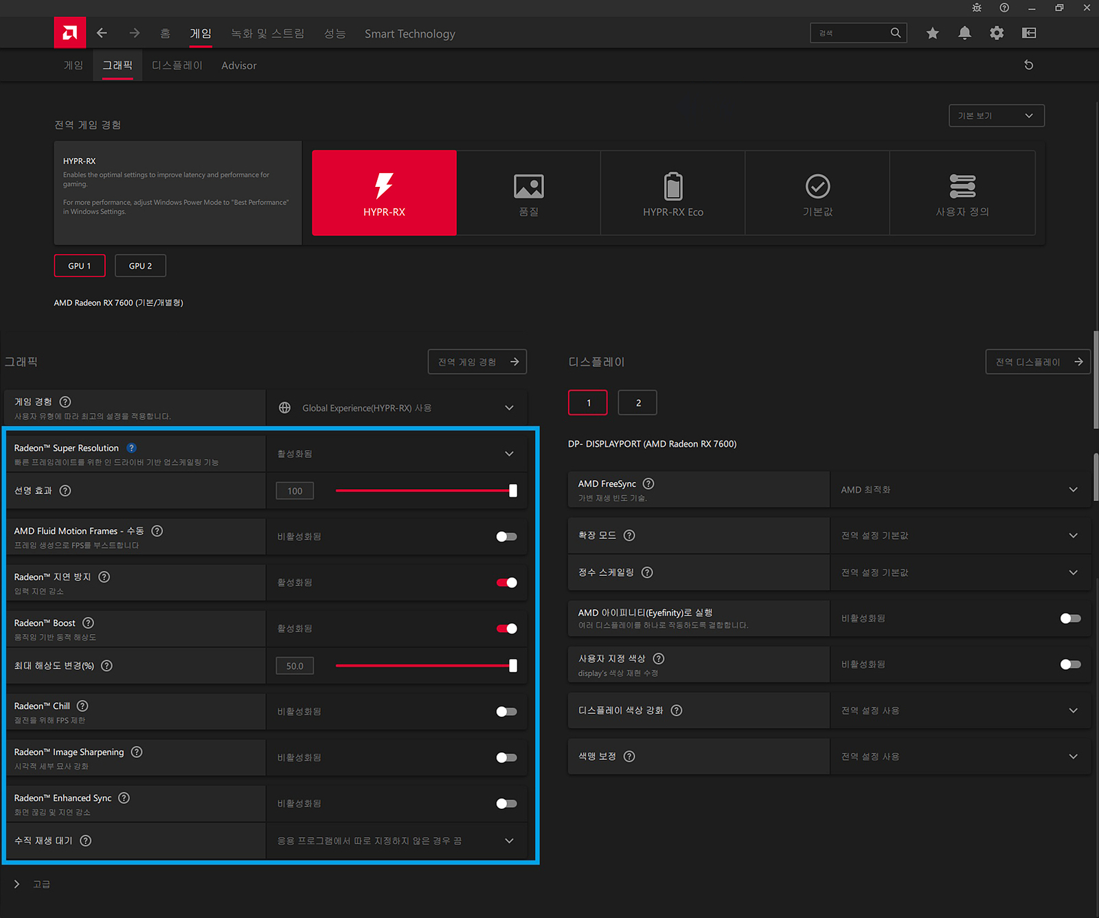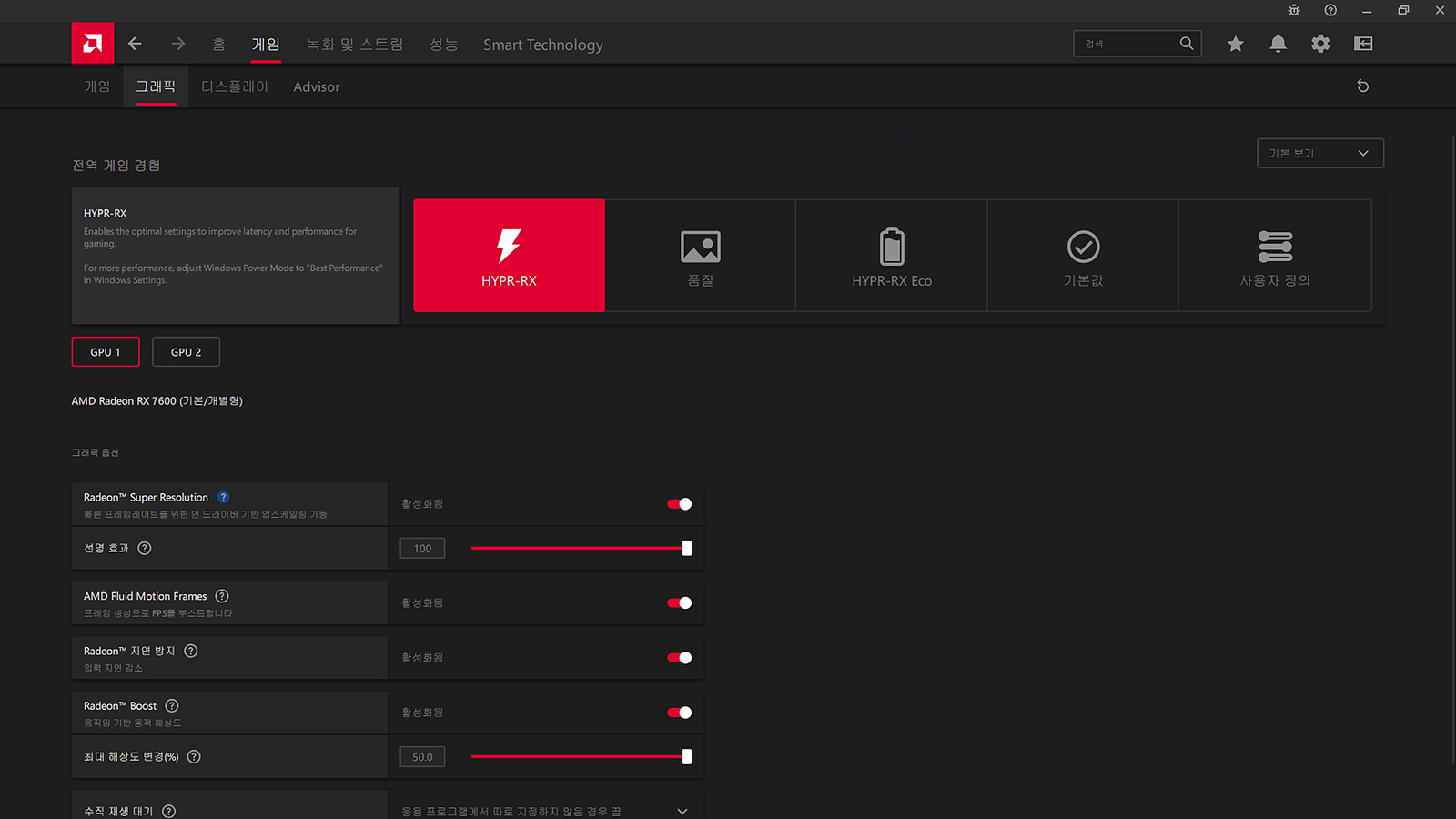 AMD Software: Adrenalin Edition에서 기본 프리셋은 HYPR-RX / 품질 / HYPR-Eco / 기본값 / 사용자 정의로 구분되면 사용자 편의에 맞게 기본 세팅이 되어 있기에 초보자도 손쉽게 선택해서 사용할 수 있습니다.
