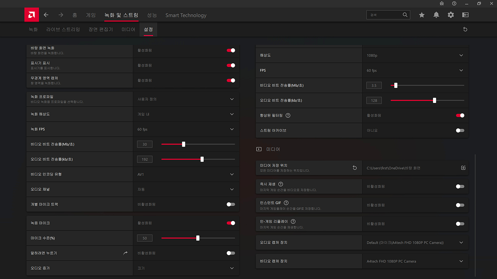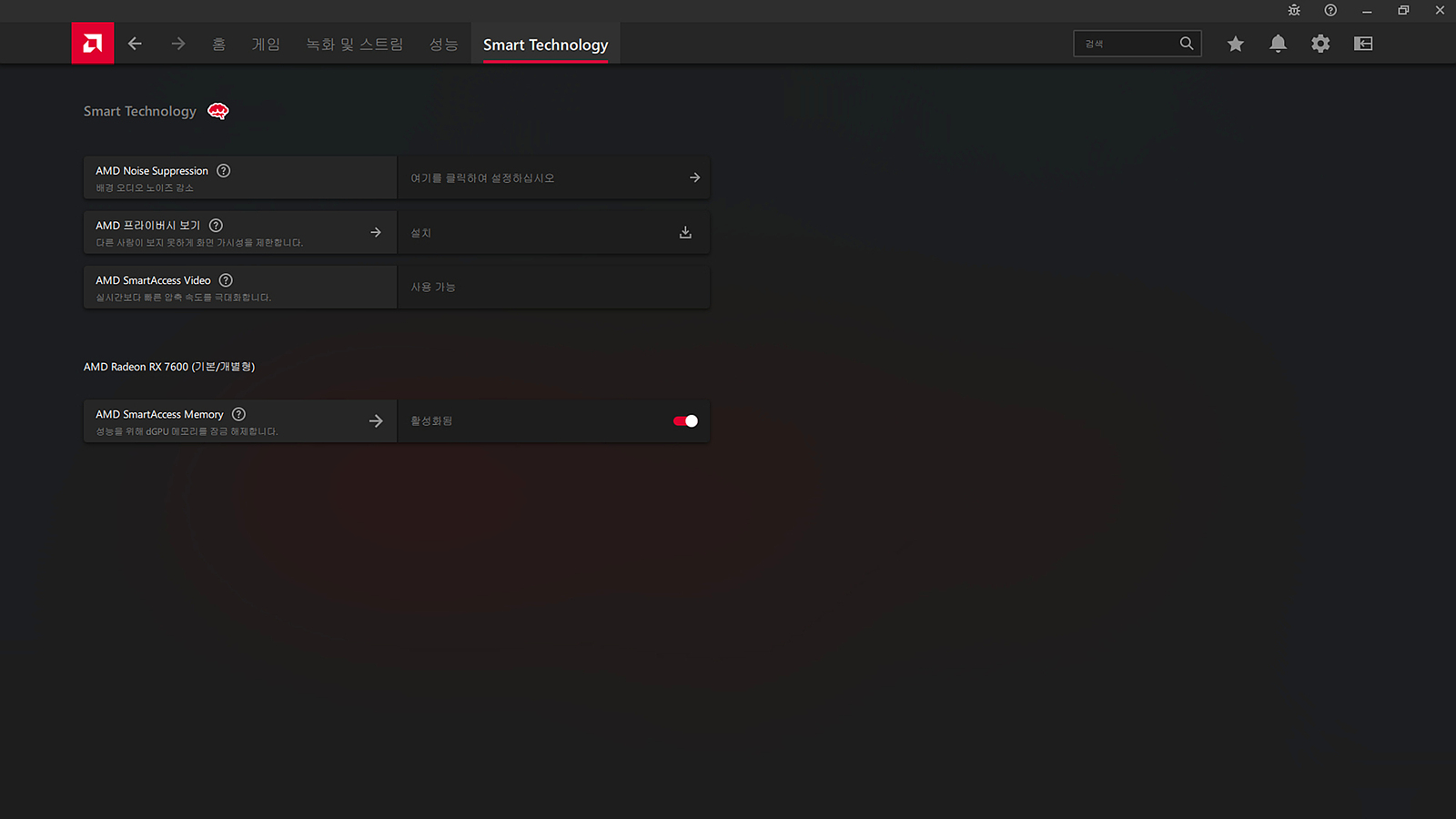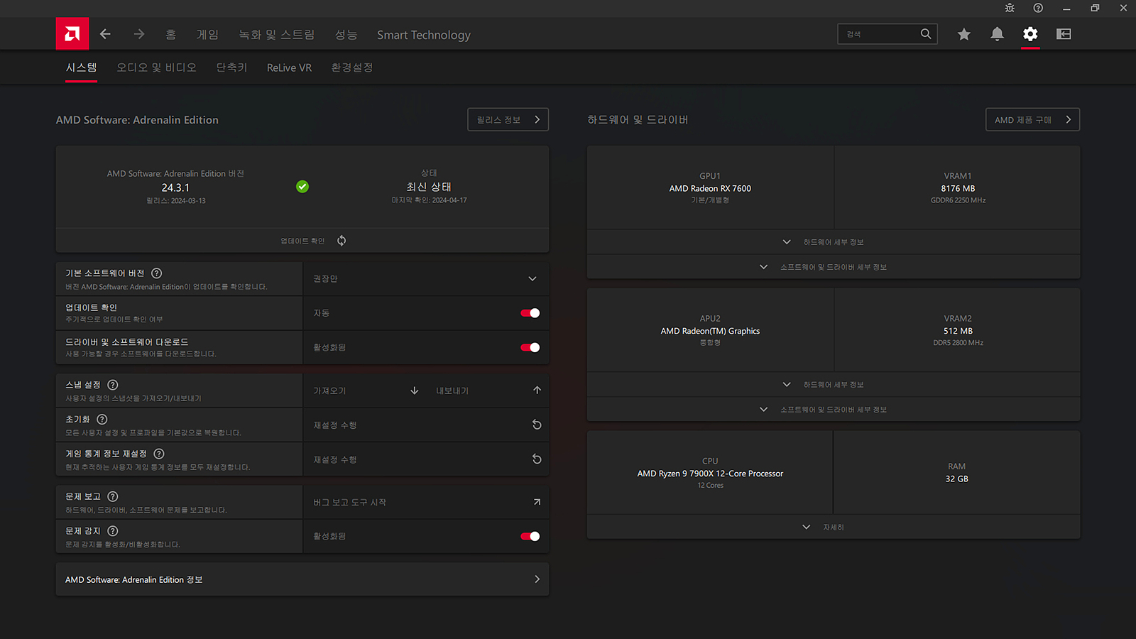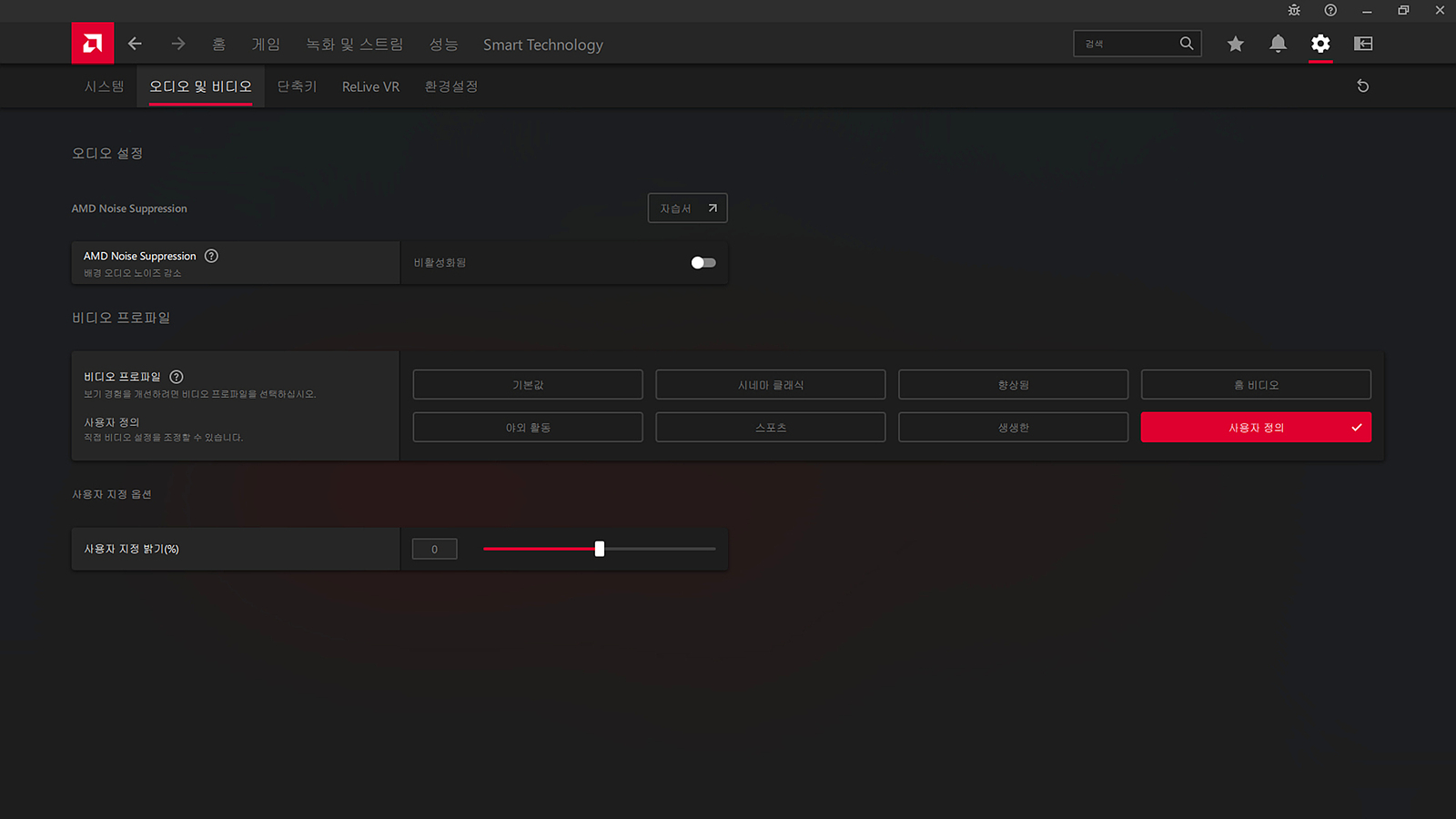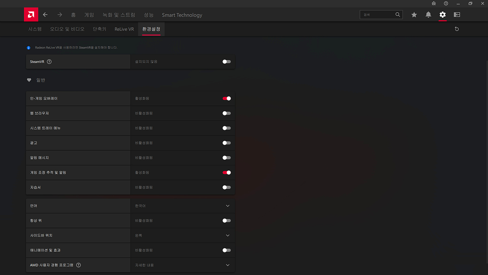 설정 항목에는 드라이버 새 버전 검색 및 다운로드 AMD Noise Suppression 통해 노이즈를 억제하여 선명한 통신 기능과 Relive VR을 오큘러스 등에 무선으로 PC VR을 플레이 할 수 있도록 설정할 수 있습니다. 환경설정에서는 Adrenalin 프로그램에 관한 알림 및 작동에 대 세부 설정이 가능합니다.