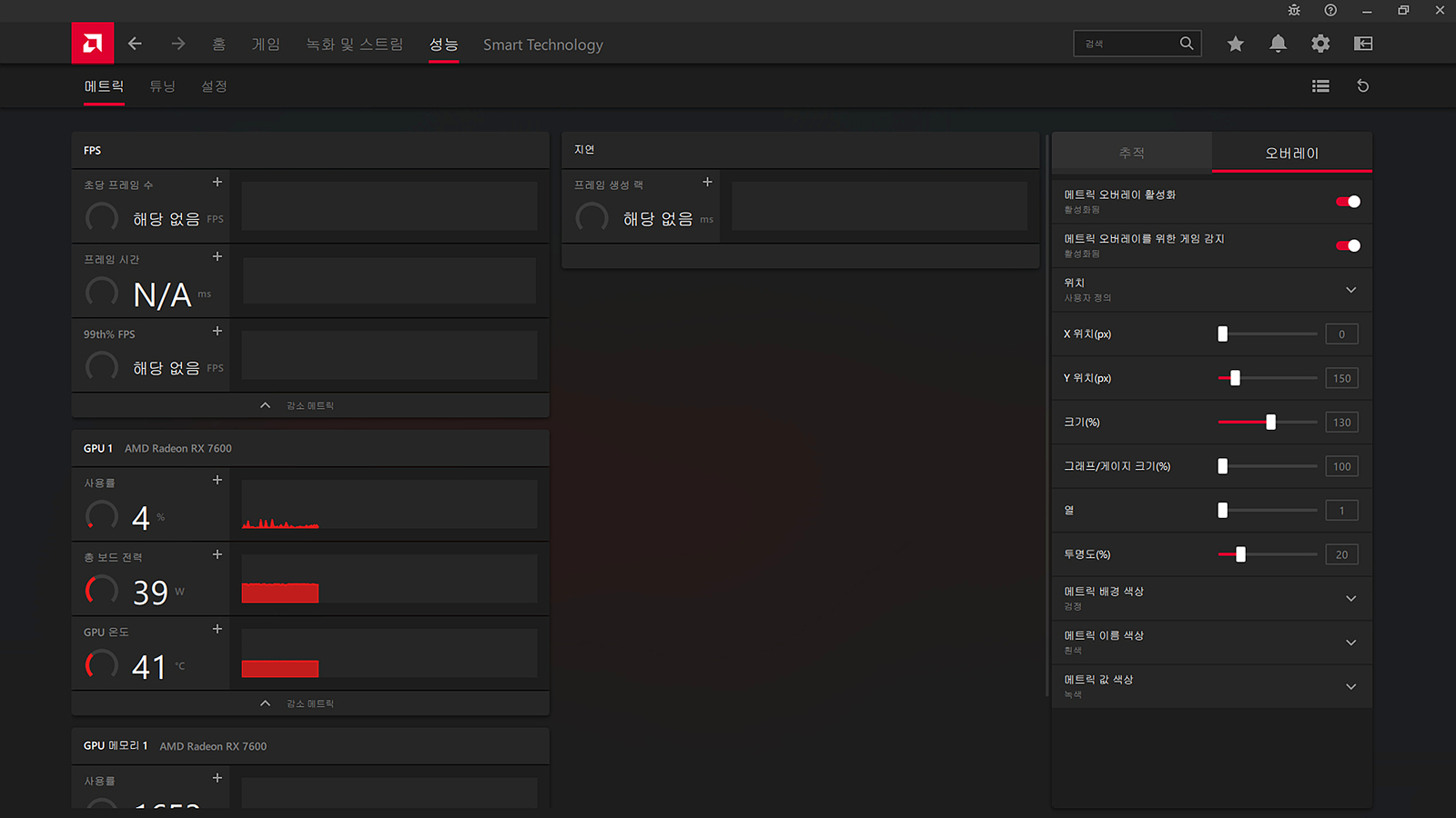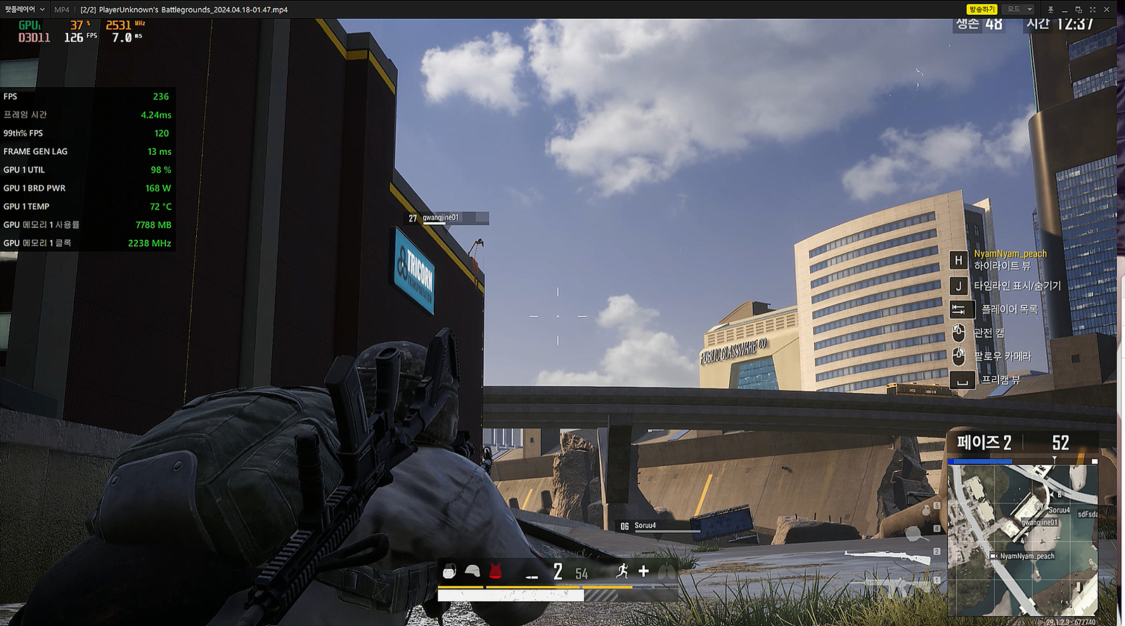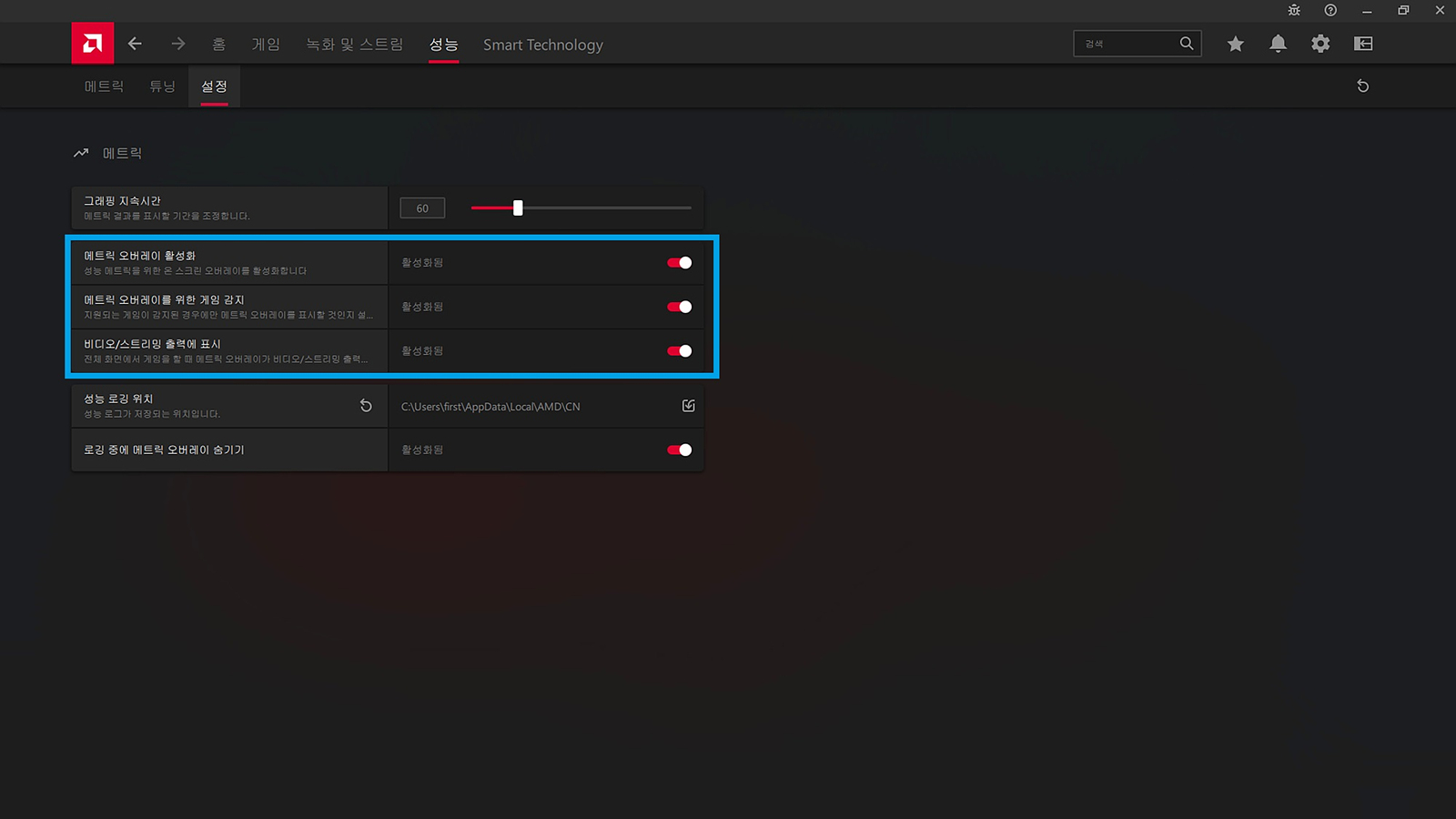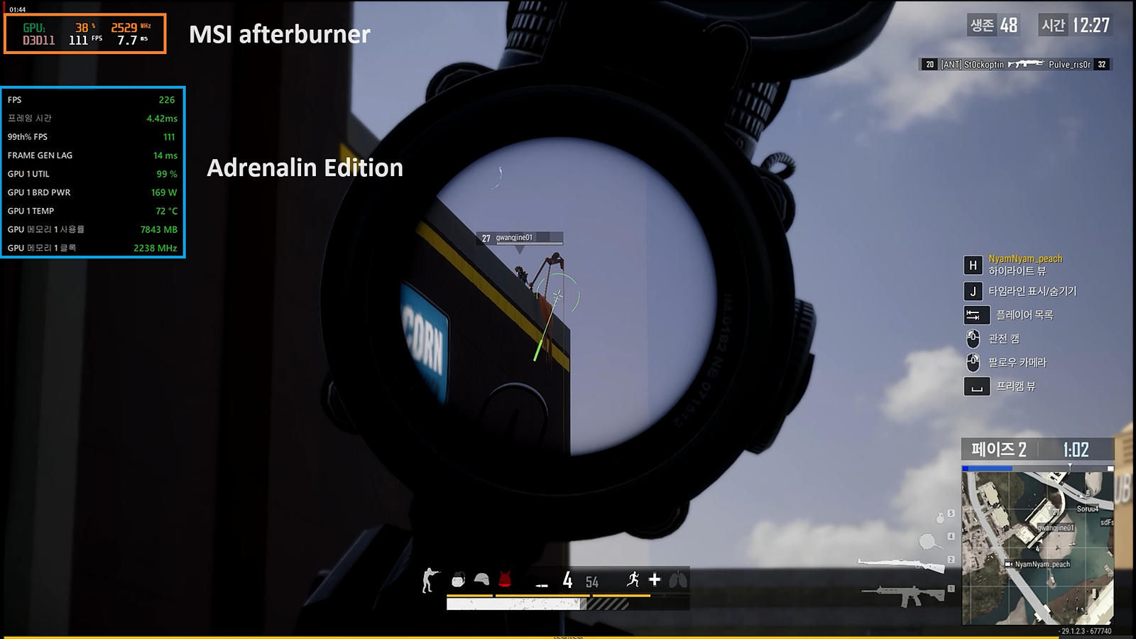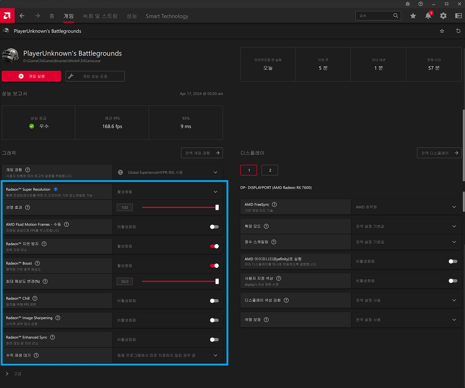 AFMF 적용된 배틀그라운드 화면입니다. 매트릭 오버레이 기능을 사용하면 실시간 현재 주사율 및 GPU를 모니터링할 수 있습니다. Nvidia처럼 프레임 측정을 위해 추가로 프로그램을 설치할 필요 없이 자체 측정이 가능하며 설치하더라도 MSI afterburner 같은 프레임 측정 프로그램은 AFMF가 적용된 프레임은 지원을 못하기에 제대로 된 프레임 측정이 불가합니다. 한 가지 참고하실 사항은 오버레이된 프레임값은 기본 녹화로는 저장이 안 되기에 성능 탭의 설정에서 비디오/스트리밍 출력에 표시를 꼭 활성화해야 같이 녹화가 가능합니다.