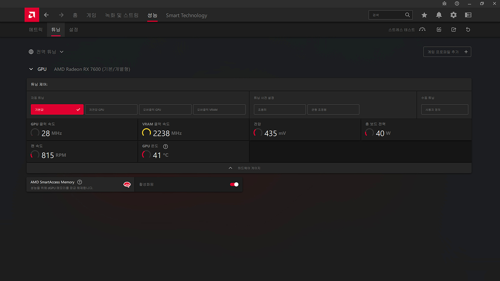 AMD는 Nvidia와 다르게 추가 프로그램 없이 아드레날린 프로그램 내에서 오버클럭 및 전압 설정이 가능합니다.
