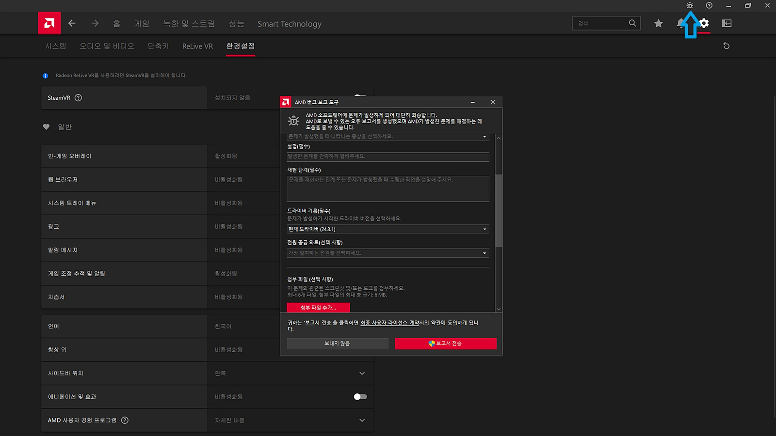 사용하면서 발생하는 문제점이 발생한다고 이제 상단의 버그 보고 도구를 이용해 AMD 소프트웨어 관리자에게 메일을 통해 직접 문의하고 답변 받을 수 있습니다.