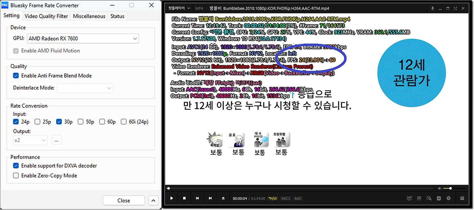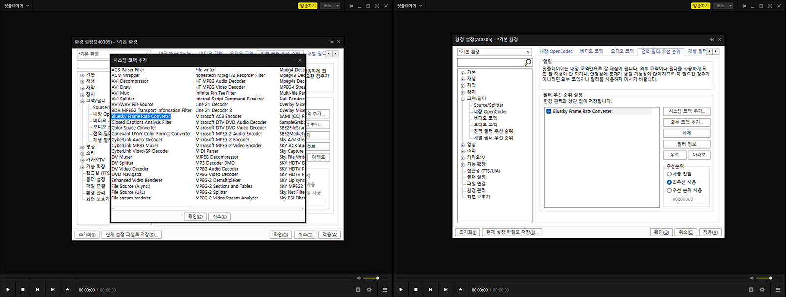 주변에서 AMD 그래픽카드를 사용하는 이유 중에 한 가지는 바로 플루이드 모션을 사용하기 위해서라고 할 정도로 최신 AMD 드라이버 설치 후 BlueSky 코덱을 이용해 팟플레이어로 영상을 보시면 24, 30프레임의 동영상을 60프레임까지 변환해서 볼 수 있습니다. 1. AMD 아드레날린 설치 2. Bluesky Frame Rate Converter 설치 3. 팟플레이어 설치 후 외부 코덱에서 BlueSky 코덱 최우선 사용 설정을 적용하면 저 프레임 영상을 부드럽게 감상할 수 있습니다. 개인적으로 Bluesky Frame Rate Converter 파일은 포터블을 사용하여 코덱 위치 지정해 주는 것보다. 설치용을 사용하여 바로 검색해서 등록하는 법을 추천합니다.