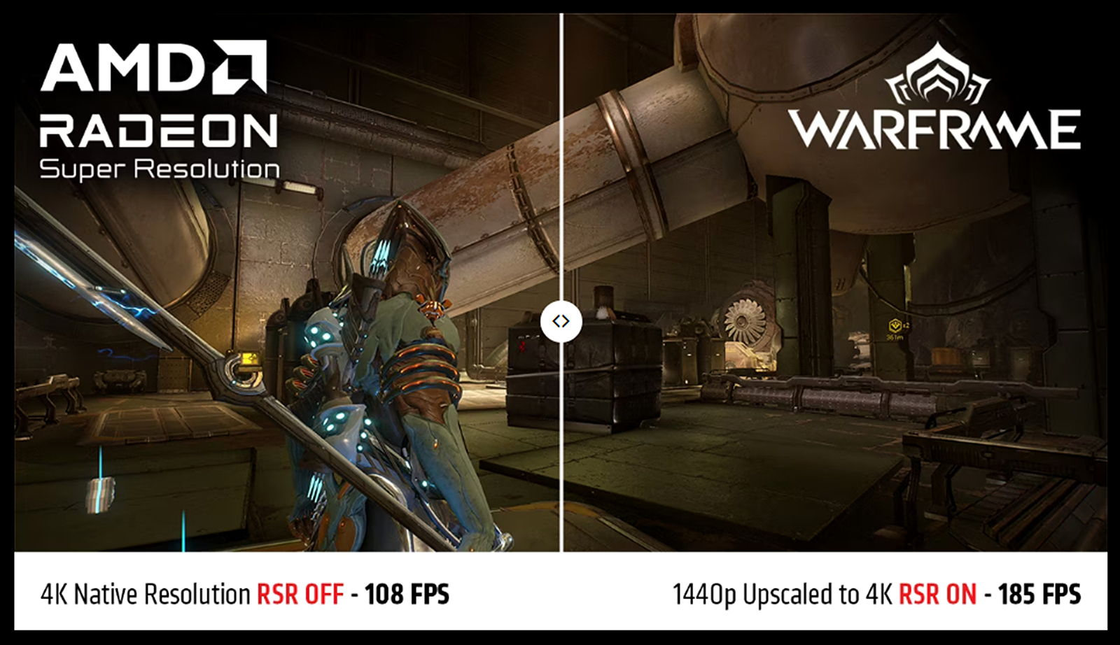 RSR (Radeon™ Super Resolution)은 FSR (Fidelity Super Resolution)과 달리 드라이버 레벨에서 적용 가능한 업 스케일링 기능입니다. 전체 화면이나 테두리 없는 전체 화면에 사용 가능합니다.