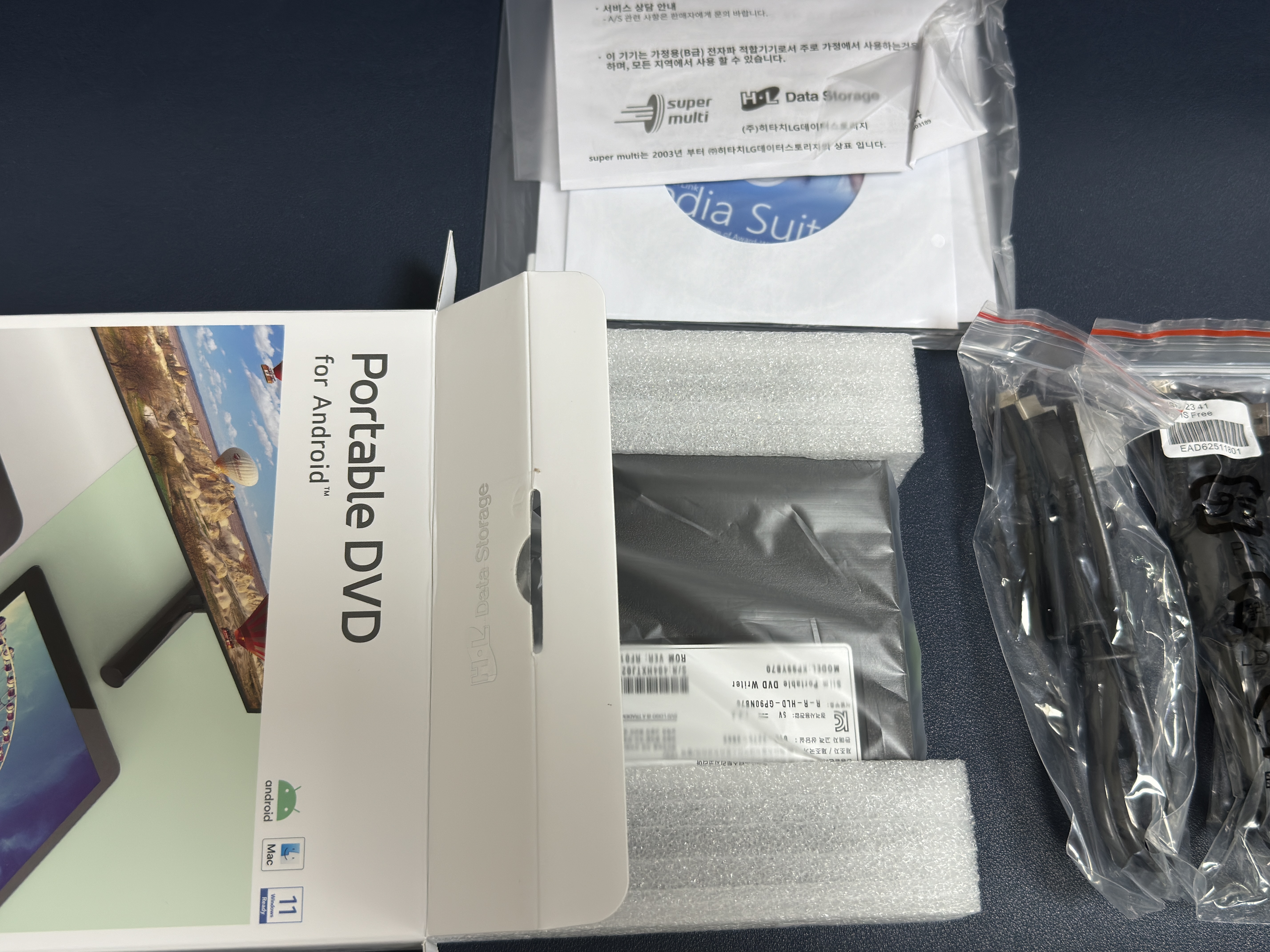 패키지는 외부 충격에서 내용물이 손상이 없도록 꼼꼼하게 포장되어 있습니다. 구성품은 외장 ODD와 케이블 두 개와 Media Suite 번들용 프로그램이 담겨있는 CD 한 장이 들어 있습니다.