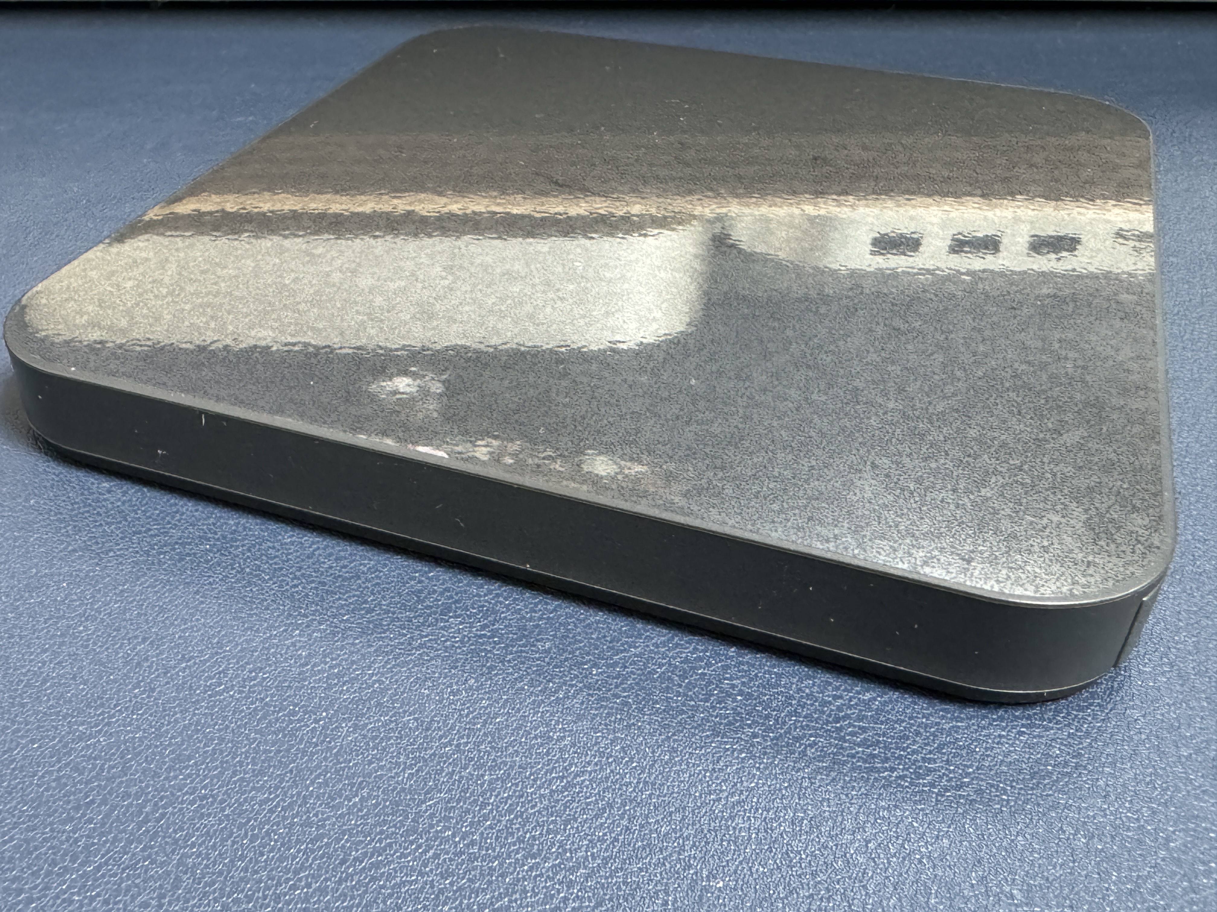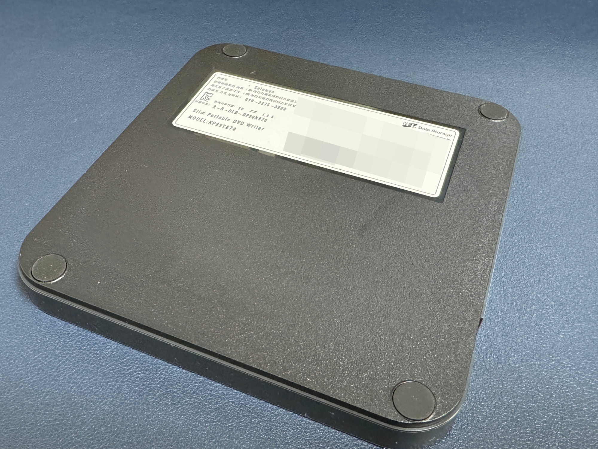 바닥면에는 외장 ODD가 작동할 때 물리적인 회전으로 인한 진동을 감소시키면서 미끄러지는 것을 막아줄 수 있는 고무 패드가 모서리 끝 쪽으로 자리 잡고 있습니다.