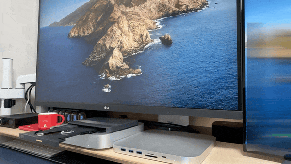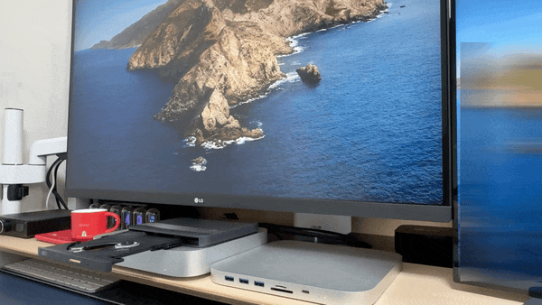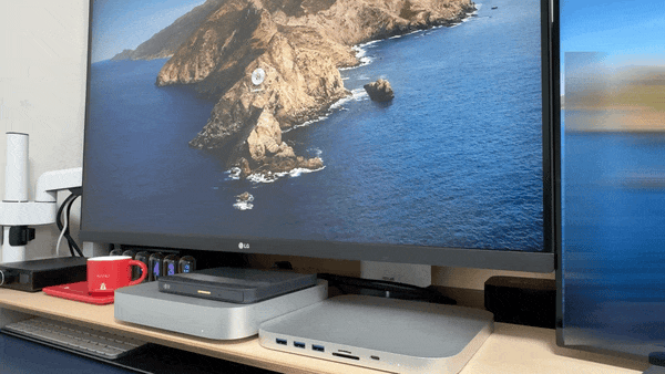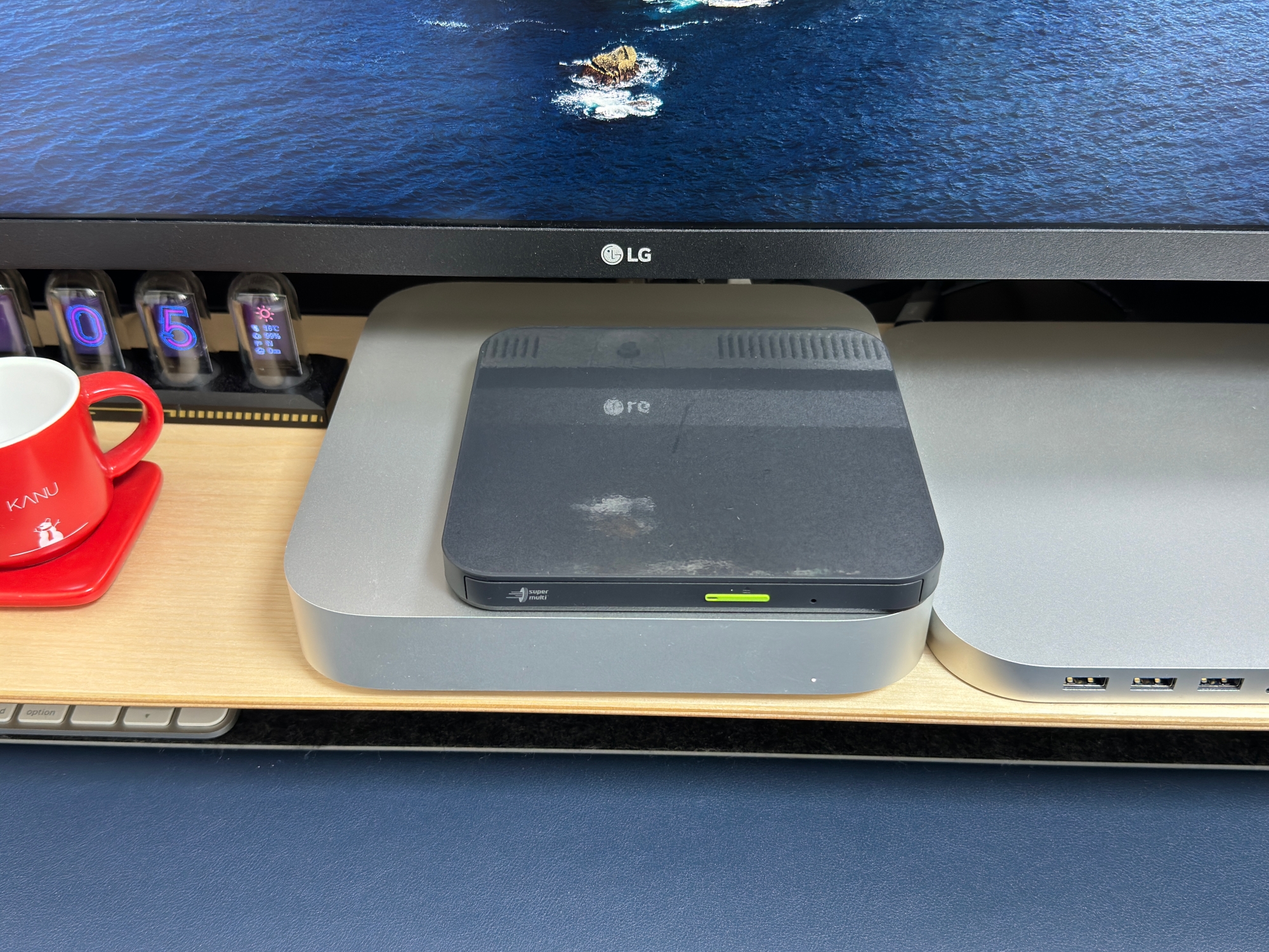 블랙 계열의 깔끔한 색상으로 포터블 외장 ODD가 맥미니와 상당히 잘 어울리는 디자인입니다. 맥미니를 데스크탑으로 이동을 할 때는 맥북에어를 사용하고 있다 보니 두 제품 전부다 내장 ODD가 없어서 그동안 CD를 사용할 수가 없었는데 이렇게 세팅을 해두니 마음에 쏙 듭니다.