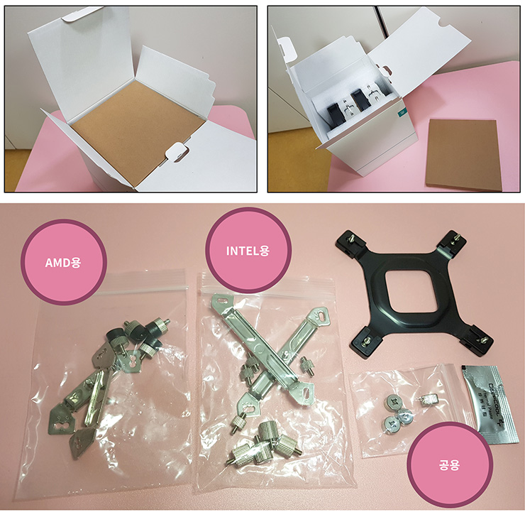 패키지를 개봉하면 납작한 골판지 상자가  보인다. 이 상자 안에는 나사와 써멀페이스트 등 핵심 부품이 들어있는데,  AMD용, INTEL용, 공용 나사가 각각 다른 비닐에 들어있다.