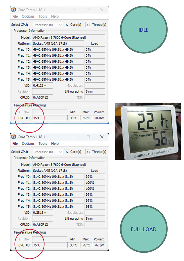 실내 온도 22도에서 벤치마크 테스트를 한 결과,  IDLE 시에는 대략 35도가 나왔고 풀로드 (시네벤치 멀티 코어 렌더링) 시에는 75도 내외가 나왔다.  전반적인 쿨링 성능이 상당하 우수한 것을 확인할 수 있다.