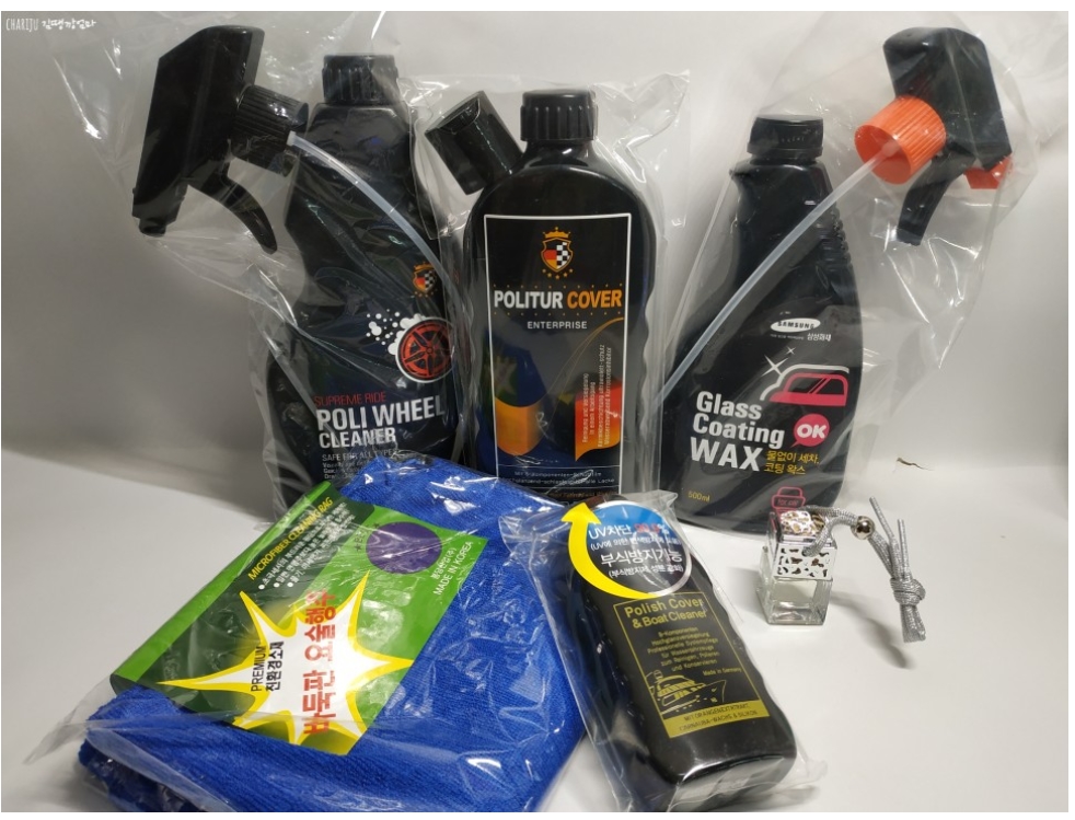 자동차의기스나, 페인트기스, 날벌레, 얼룩,이물질 등을 제거하는 폴리쉬커버와, 차량 뿐 아니라 각종 금속재질, 평대리타일,플라스틱, 구리 등에 피막을 형성하여 긁힘과 충격으로부터 보호하는 폴리쳐커버, 그리고 휠의 오염과 잔기스,부식방지를 관리하는 폴리휠클리너, 다용도타올2장이 한세트이다.