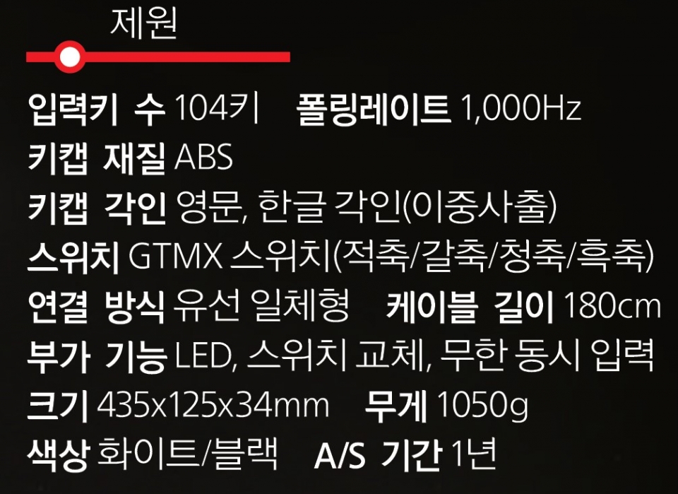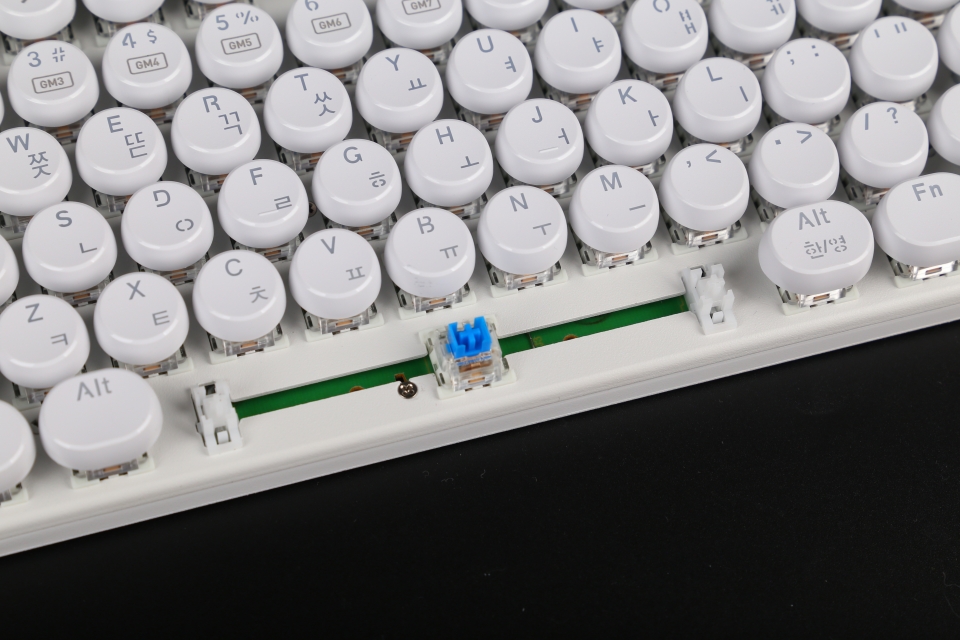 리뷰에 사용된 제품은 GTMK 청축 스위치 모델이다. 스위치의 기대 수명은 5,000만회에 달하고 체리식 스테빌라이저를 품어 기다란 키도 안정적으로 입력할 수 있다.