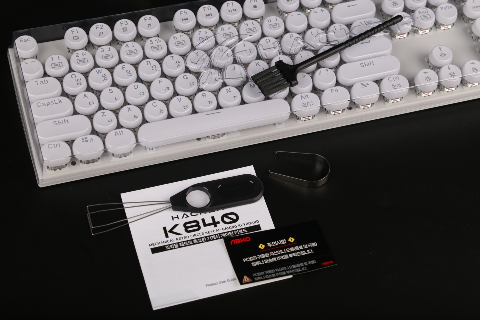 구성품도 제법 푸짐하다. 가성비 제품임에도 키보드 루프, 키캡 리무버, 스위치 리무버, 청소 브러쉬, PC방용 스티커가 기본 제공된다.