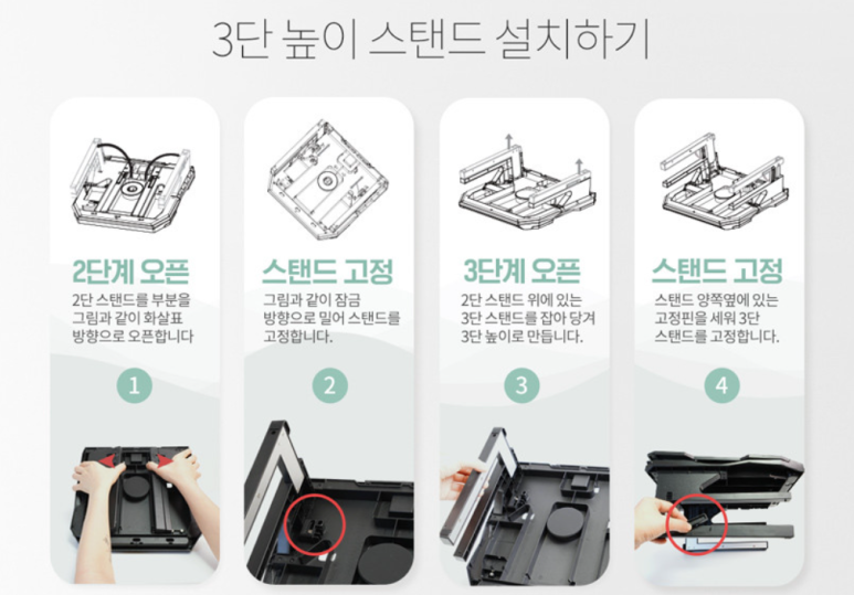 3단계 노트북거치는 조립을 통해 사용하실 수 있어요. 바닥면에 스탠드를 오픈하시면 됩니다.