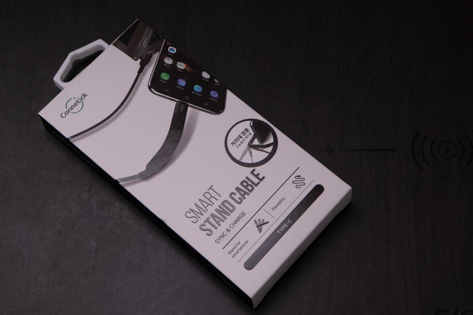 커네틱 스마트 스탠드 케이블의 케이스입니다. 거치대 겸용이라고 써 있는 게 보이는데요. 스마트폰 그립을 사용한다면 거치대 역할을 하는 것도 있어서 케이블까지 거치대 기능을 하는 게 필요하지는 않겠지만, 저처럼 무선충전도 자주한다면 그립보다는 이런 충전기 겸용 거치대도 괜찮을 거에요. 들고 다니기에도 편하구요.