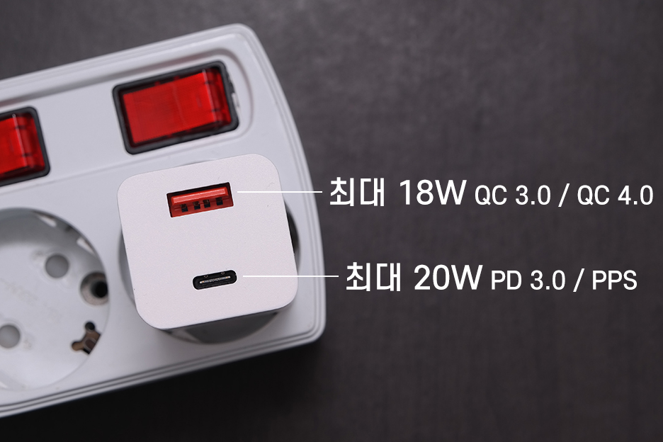 USB-C타입 포트는 PD충전과 PPS충전을 지원하고, 네모난 USB-A타입 포트는 QC충전을 지원하죠.