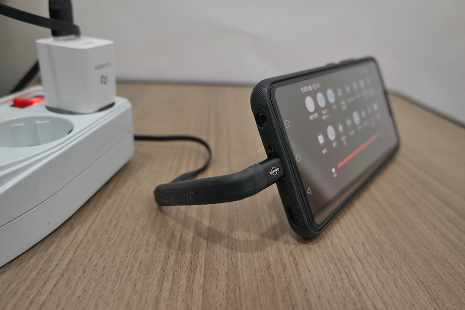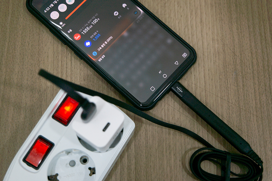 충전하면서 거치대 기능이 되는 충전기로 충전하는 모습도 잠깐 찍어봤습니다. 휘어지는 형태라서 원하는 형태로 각도를 조절할 수 있습니다.