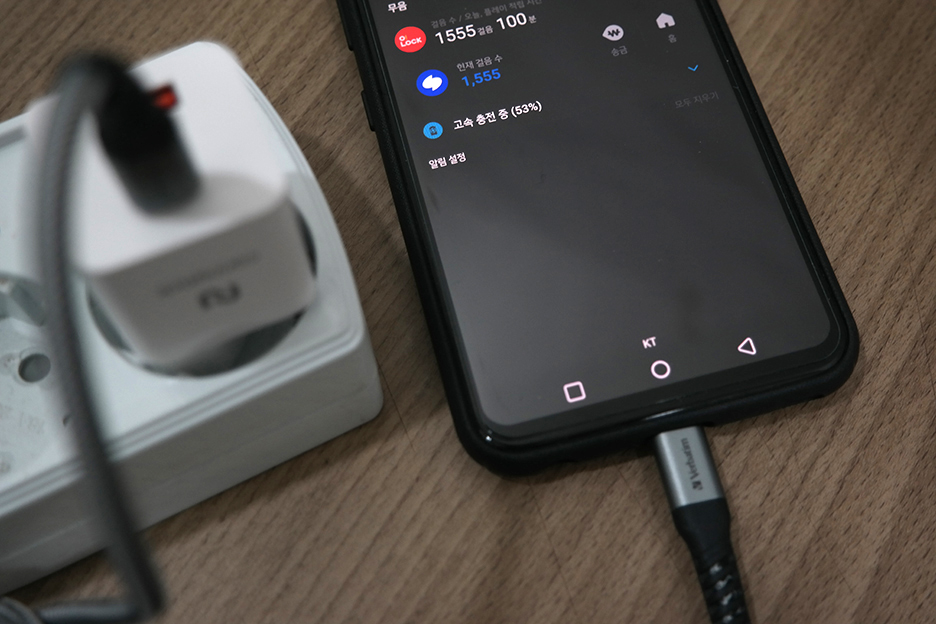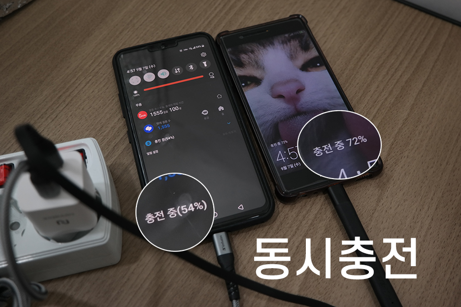 한 개의 스마트폰을 고속충전하다가 고속충전을 지원하는 다른 스마트폰을 연결했습니다. 그러니 얼마 후 고속충전은 종료되고 2개의 스마트폰 모두 일반 충전으로 충전이 시작되었습니다.