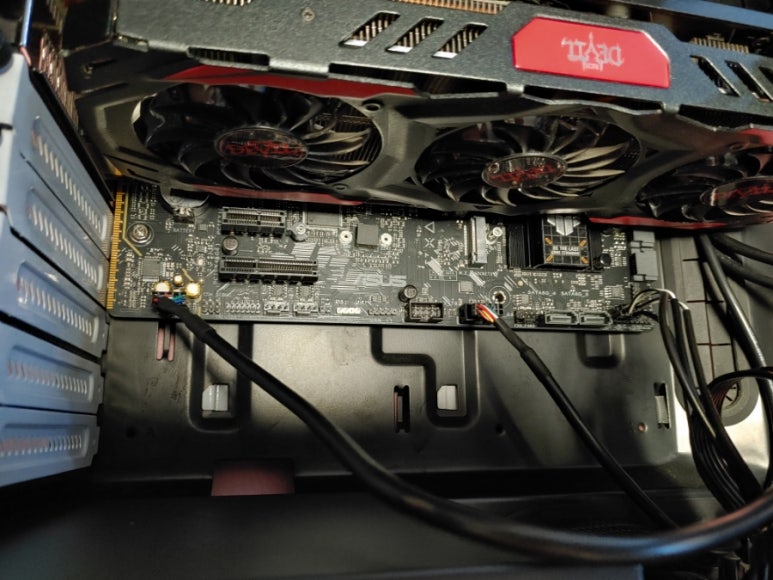 PC케이스에 장착을 완료했어요. M-ATX보드라 다양한 케이스에 장착이 가능해요.