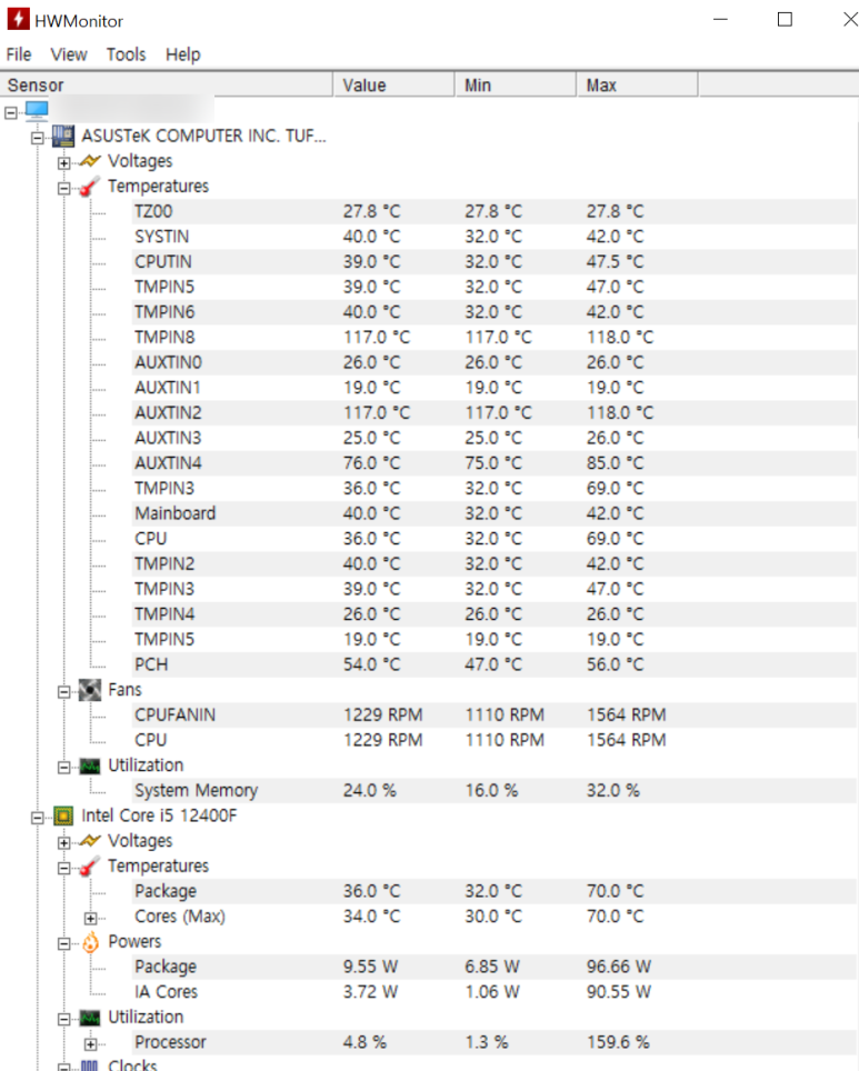 타임스파이와 OCCT테스트중 시스템 온도도 정상유지 되는걸 확인 할 수 있었네요.