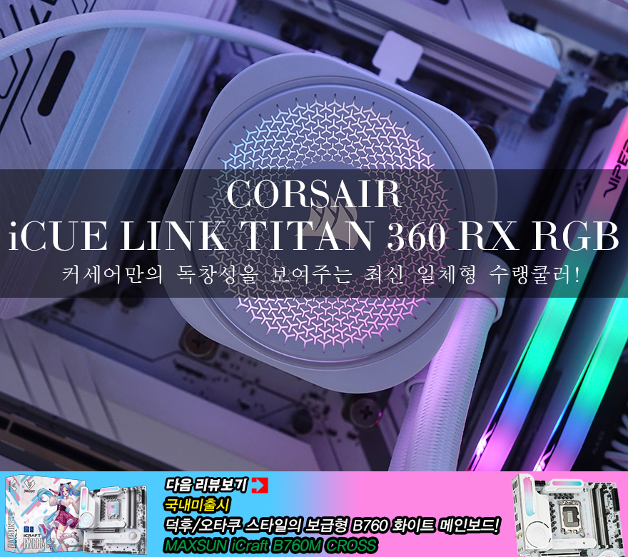 CPU 쿨러시장은 공랭과 수랭 2가지로 나뉘고 있죠. 공랭과 수랭 각각 장단점이 있지만, 고사양 조립 PC를 맞추는 경우에는 점점 수랭쿨러를 많이 선택하고 있는 추세입니다. 국내 PC시장에서 오랫동안 활동하고 있는 미국의 대표적인 PC하드웨어 브랜드 커세어(CORSAIR) 역시 예전부터 CPU 쿨러 제품군을 갖추고 있었습니다. 특히, 수랭쿨러 제품 같은 경우에는 RGB 효과가 추가되면서, 커세어의 RGB 컨트롤 및 시스템 모니터링 소프트웨어 iCUE 지원으로 확장되었죠. 그리고, 최근에는 커세어만의 쿨링시스템을 갖출 수 있는 허브 장치가 포함된 iCUE Link를 선보이면서 PC케이스, 쿨링팬, 그리고 수랭쿨러 제품군까지 적용되었습니다. 그래서, 오늘은 이 iCUE Link 허브가 추가된 커세어의 가장 최신 수랭쿨러 제품을 만나보는데, 바로 iCUE LINK TITAN 360 RX RGB입니다. 그럼, 커세어 iCUE LINK TITAN 360 RX RGB 일체형 수랭쿨러를 한 번 살펴보도록 하죠.