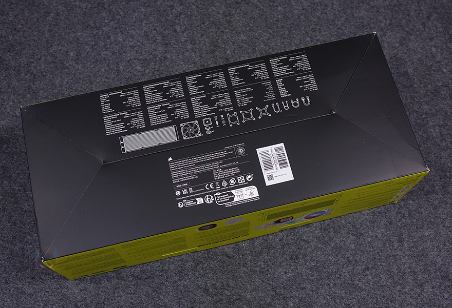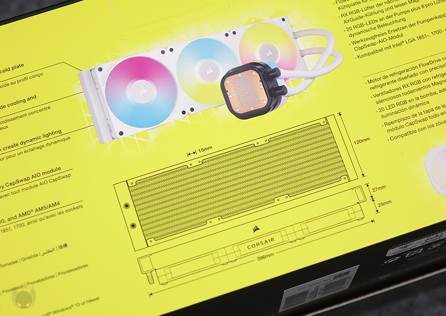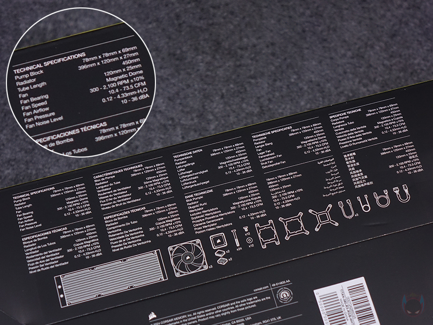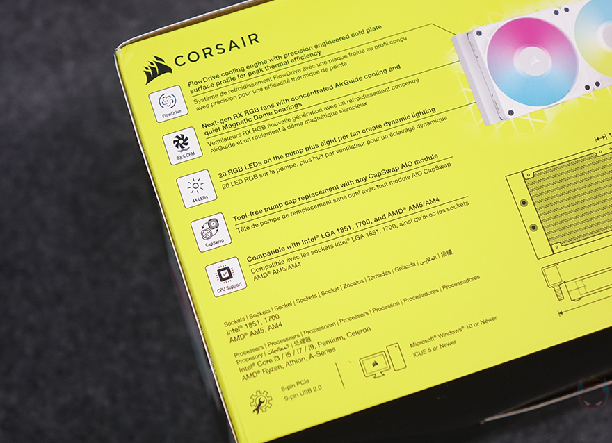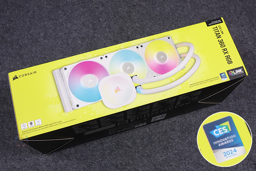 제품 패키지 형태는 박스 전체까지 밀봉된 상태로 소비자입장에선 좀 더 판매 제품에 신뢰를 가질 수 있습니다. 제품 박스를 좀 더 살펴보면, 상단에는 제품 이미지와 함께 모델명 그리고 iCUE LINK 지원 표기를 확인할 수 있죠. 박스 한쪽 측면에는 좀 더 큰 이미지도 제품 이미지를 확인할 수 있고, 올해 CES 2024에서 혁신상을 받은 제품이라는 것도 알 수 있죠. 반대쪽 측면에는 제품의 주요 특징을 언급하고 있는데, 이 제품의 가장 큰 특징 중 하나인 커세어 자체 펌프 설계의 3상 모터 기술 플로우드라이브 쿨링엔진(FlowDrive cooling engine), 마그네틱 돔 베어링방식의 RX RGB 팬, 펌프에 내장된 20개의 RGB LED, 펌프 캡을 교체할 수 있는 CapSwap 모듈 디자인, 최신 CPU 소켓 지원을 언급하고 있습니다. 바로 옆에는 제품의 기본 사이즈 표기도 확인할 수 있죠. 그리고, 제품의 기본 사양 및 제품 구성품 목록은 박스 밑면에서 확인할 수 있습니다.