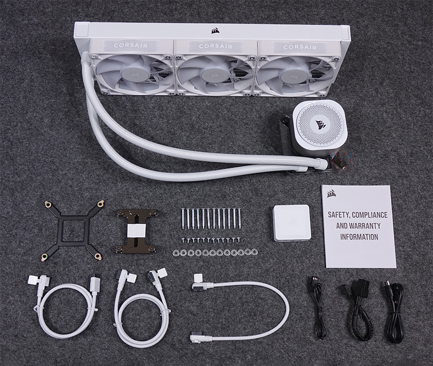 박스를 열어보면, 오픈 과정에서 설치 가이드 안내 문구를 확인할 수 있는데, iCUE LINK TITAN 360 RX RGB 제품은 별도의 설명서 제공없이 QR코드를 통한 웹에서 설치가이드(바로 보기)를 참고할 수 있습니다. 제품 포장은 쿨러는 비닐 포장, 나머지 구성품들은 종이 포장재를 사용했으며, 제품 구성에는 iCUE LINK TITAN 360 RX RGB 일체형 수랭쿨러, 인텔용 백플레이트, AMD용 브래킷, 팬 및 라디에이터 나사 및 와셔들, iCUE Link 허브, 600mm 스트레이트&90˚ iCUE Link 케이블, 600mm 90˚ iCUE Link 케이블, 250mm 90˚ iCUE Link 케이블, 800mm 테크 케이블, 150mm PCIe 전원 케이블, 500mm 마이크로 USB 2.0 케이블, 보증서로 이루어져 있습니다.