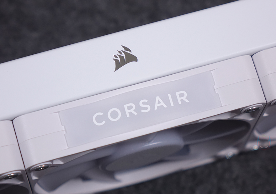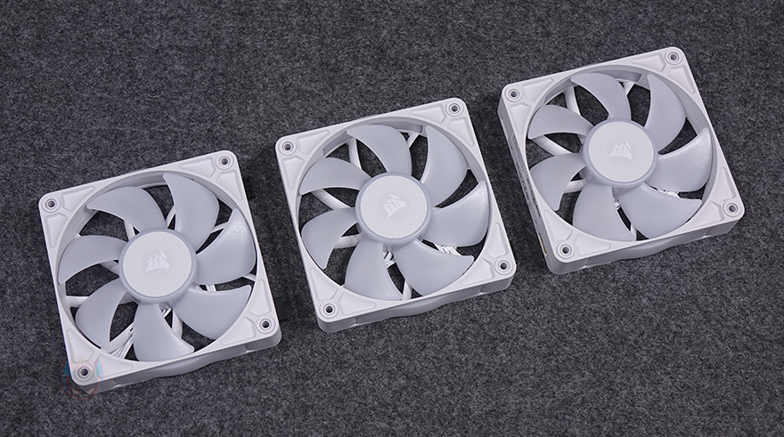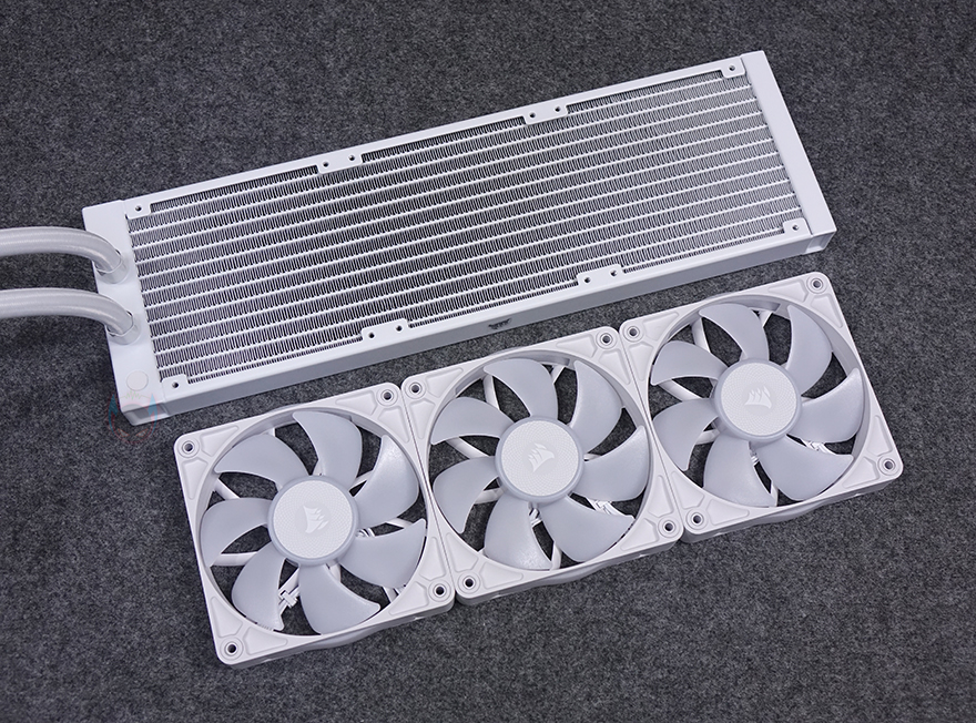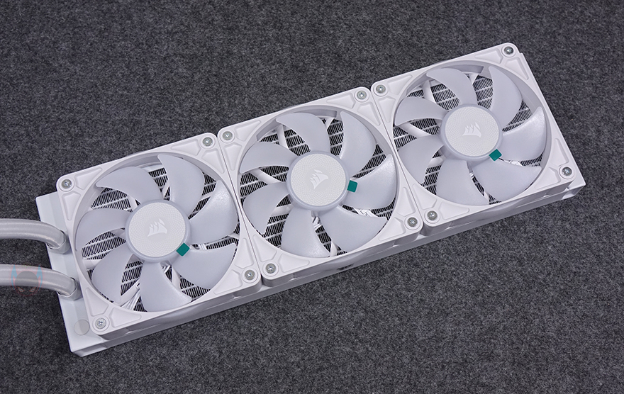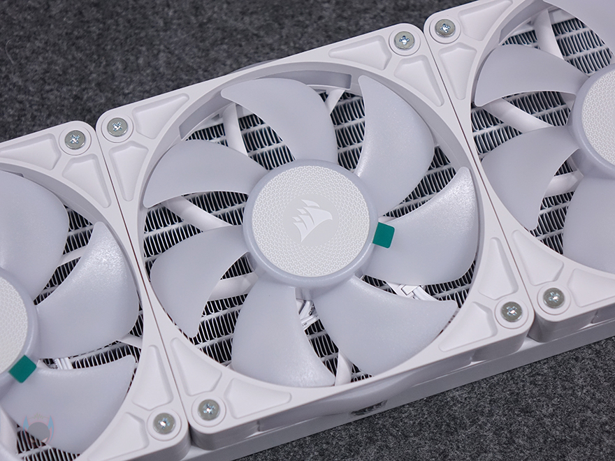 커세어(CORSAIR) iCUE LINK TITAN 360 RX RGB 일체형 수랭쿨러를 본격적으로 살펴보면, 리뷰에 사용된 모델은 라디에이터에 120mm 팬 3개가 장착된 360mm 제품이며, iCUE LINK TITAN RX RGB 시리즈는 240mm와 280mm, 360mm 3가지 라디에이터 길이로 출시되었습니다. 라디에이터에 기본 장착된 팬은 RX RGB 팬으로 전형적인 120x120x25mm 규격을 가졌으며, 개봉 시 팬 중앙 로고 부분에는 보호비닐이 부착되어 있으며, 7개의 날개를 가졌습니다. 참고로, 팬 속도 범위는 300~2100 RPM이며, 베어링 방식은 앞서 제품 박스 표기에서 확인했듯이 마그네틱 돔 방식을 적용하고 있습니다.