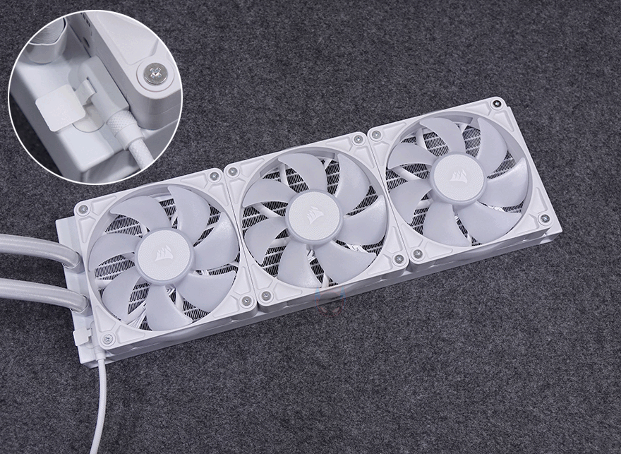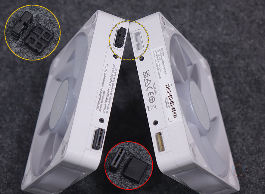 라디에이터에서 RX RGB 팬을 분리해 좀 더 살펴보면, 팬끼리는 케이블 없이 연결되는 데이지 체인 방식을 적용하고 있습니다. 팬 측면을 보면 2개의 포트가 적용되어 있는데, 서로 연결되기 위해서는 브릿지 장치를 사용합니다. 하나는 서로 연결되는 지지대 역할의 패시브 브리지, 또 하나는 작동 연동을 시켜주는 액티브 브리지죠. 그리고, 라디에이터에 장착된 상태에서는 iCUE Link 허브와 연결시켜 주는 iCUE Link 케이블을 양쪽 측면 중 원하는 측면에 있는 액티브 포트에 케이블을 연결시켜 주면 됩니다.