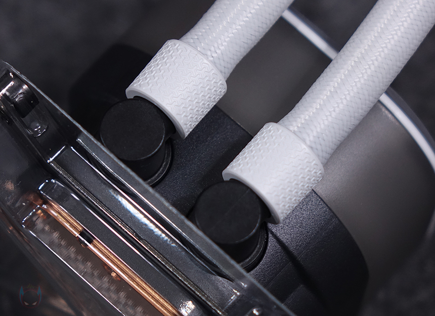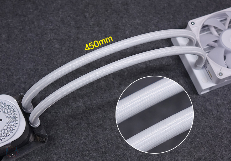 라디에이터와 워터블록을 연결해주는 튜브는 총 45cm 길이를 가졌으며, 저투과성 고무재질에 외부 마감은 전체 슬리빙처리를 했습니다. 또한, 라디에이터와 워터블록 양쪽 연결부 역시 누수가 발생하지 않도록 깔끔하게 마감되어 있죠.