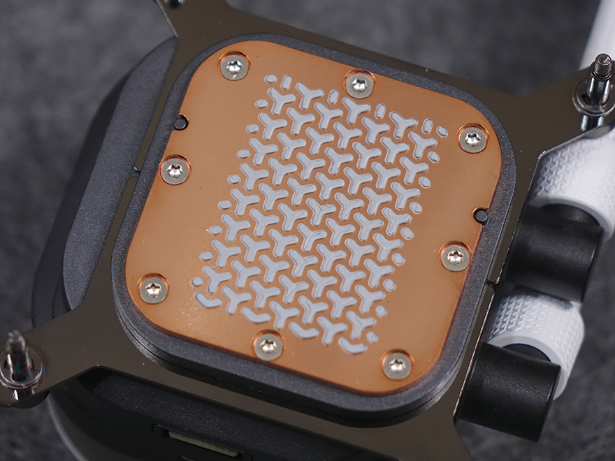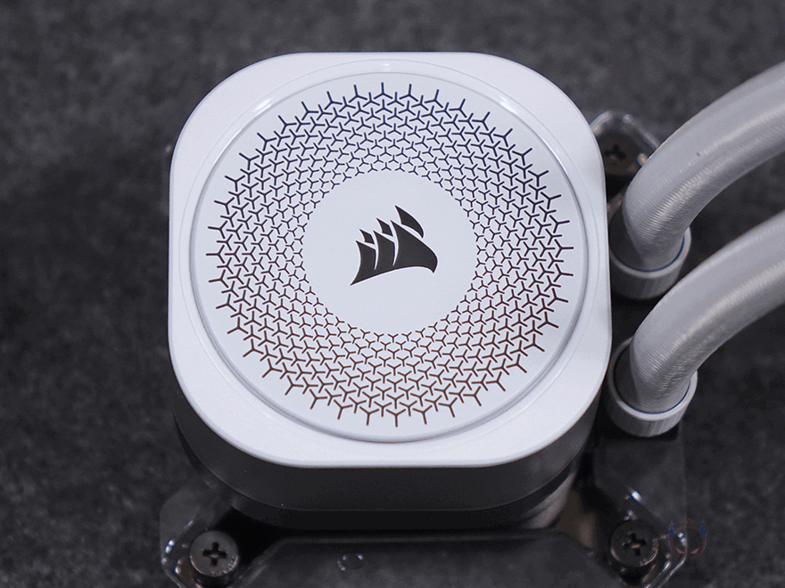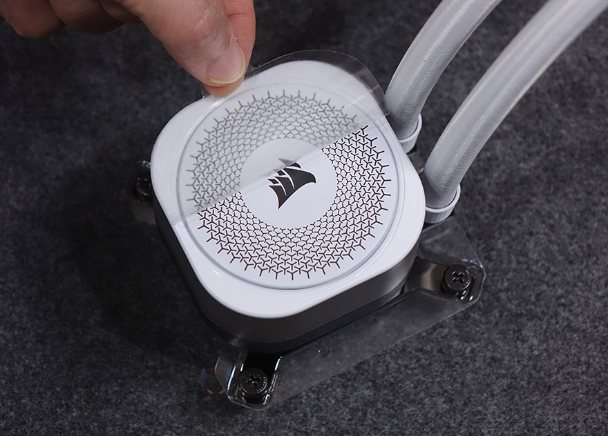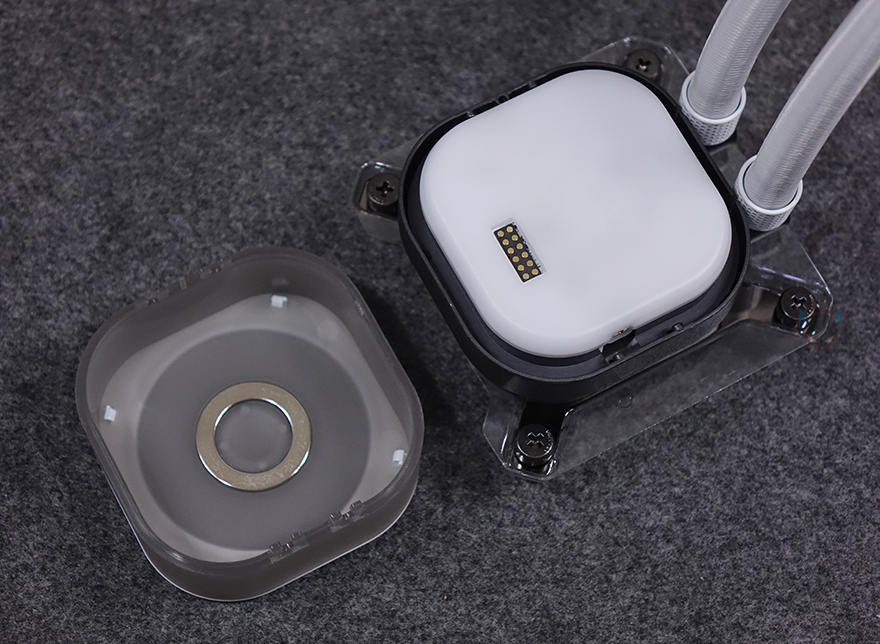 워터블록은 개봉시 상단 로고 부분에 보호비닐이 부착되어 있으며, 로고 부분은 자석방식의 분리형 플레이트로 플레이트 안쪽 돌기와 펌프 캡 상단 4개의 홈에 따라 90˚ 방향씩 로고 방향을 전향할 수 있습니다. 그리고, 플레이트 아래인 펌프 캡 부분은 모듈방식으로 분리할 수 있는데, 기본 캡 외에 별도로 그루브, VRM 팬, LCD 스크린 캡 모듈을 판매하고 있어서 사용자가 언제든지 원하는 취향으로 변경할 수 있죠. 내부에 포고핀(Pogo-pin)도 확인할 수 있는데, VRAM 팬이나 LCD 스크린 캡 모듈을 장착했을 때 이용됩니다. 커세어를 이렇게 펌프 캡을 교체할 수 있는 방식을 CapSwap이라고 부르고 있죠. 그리고, 펌프 안에는 20개의 RGB LED가 내장되어 있습니다.